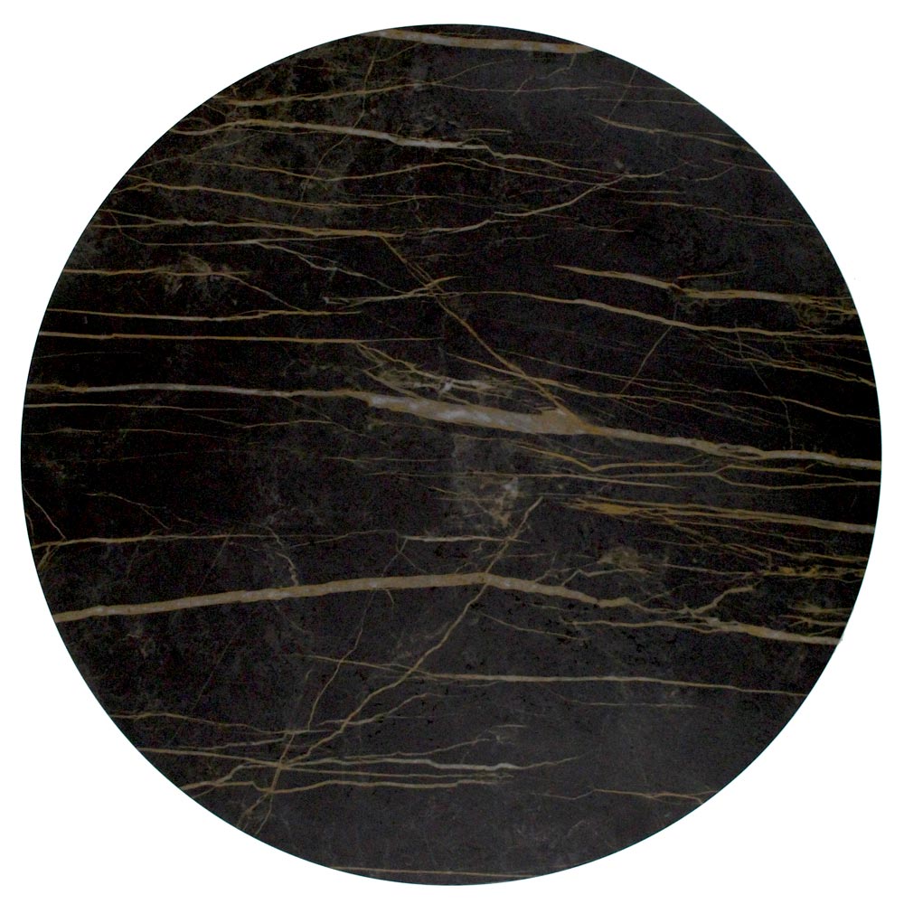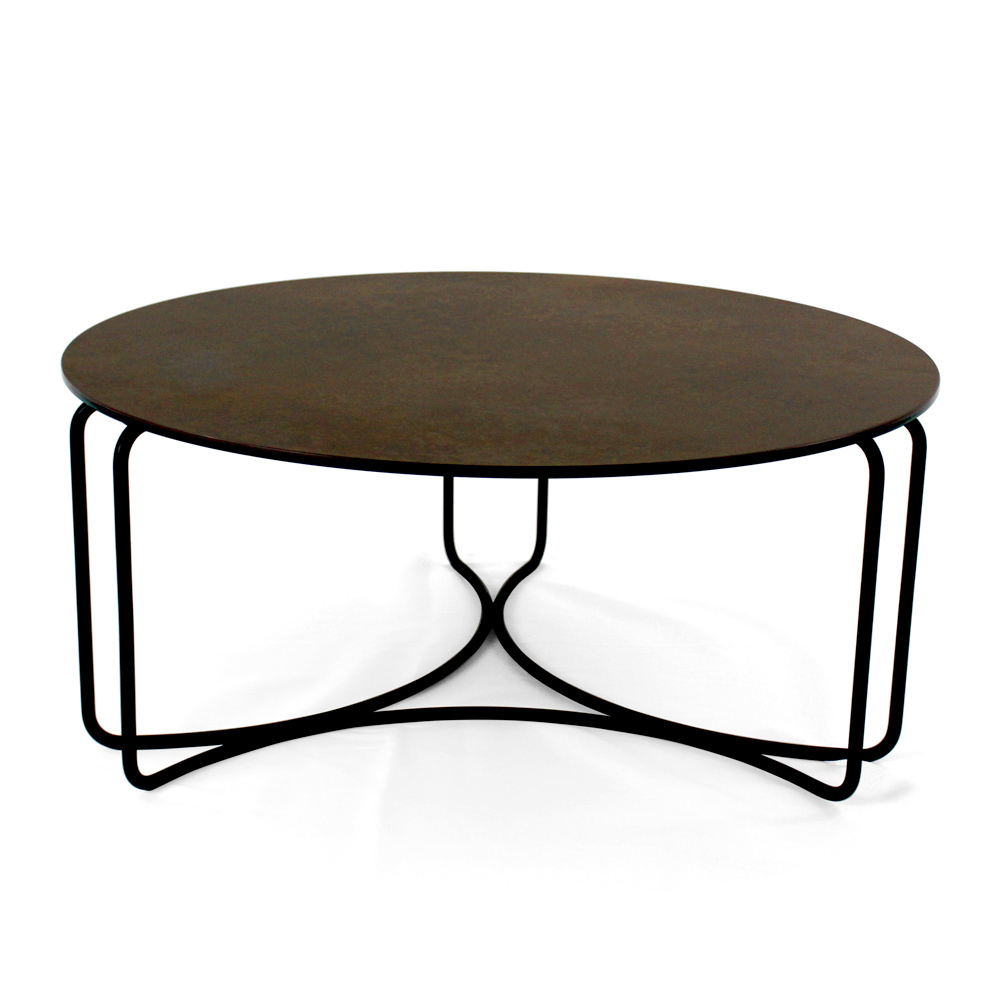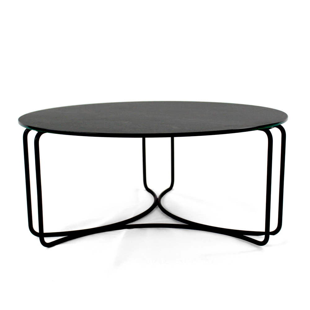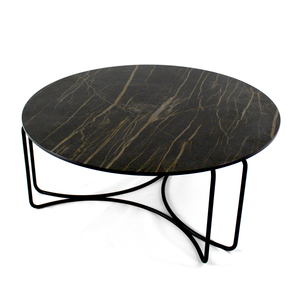 Rundt sofabord med understel af malet stål og top af porcelæn i stentøj.