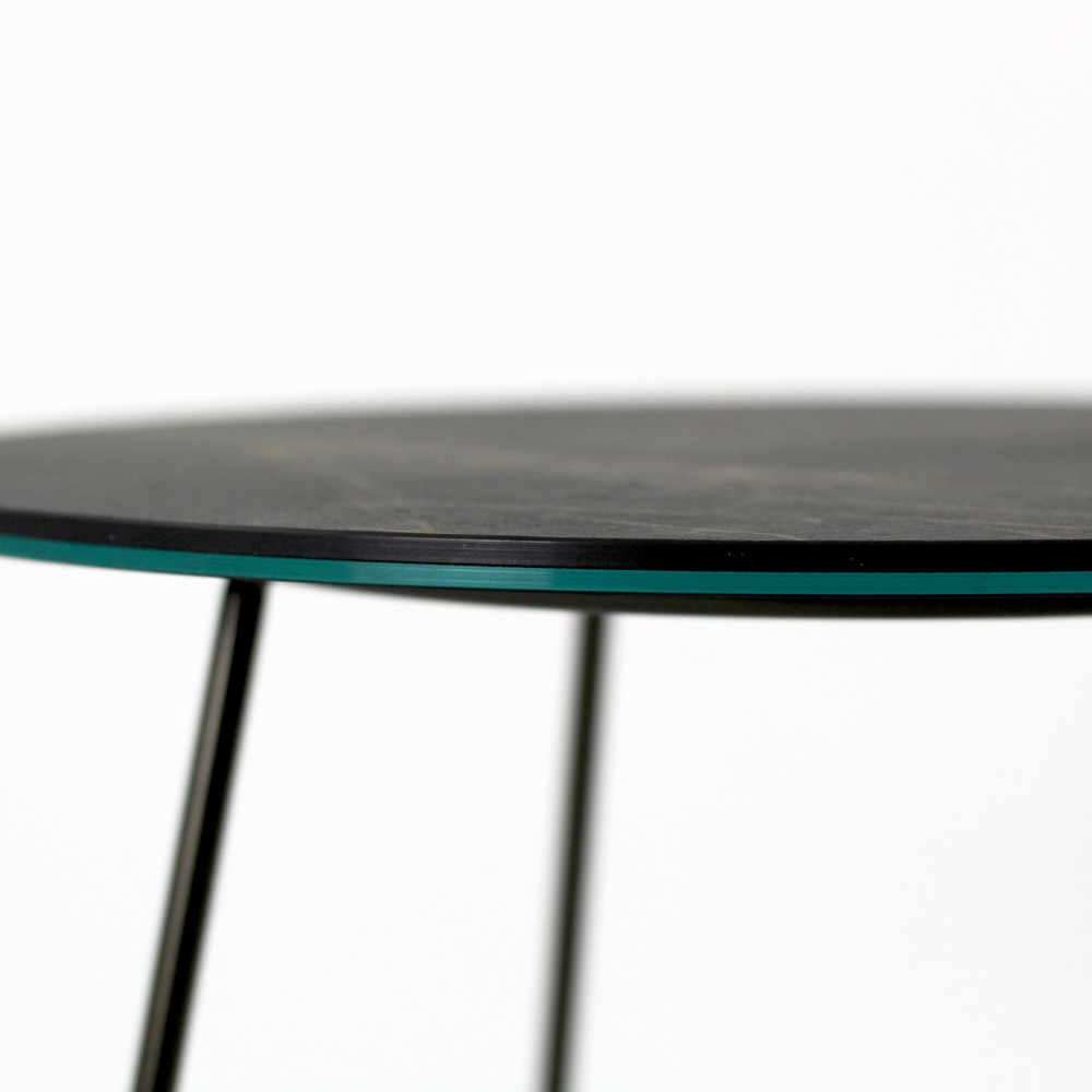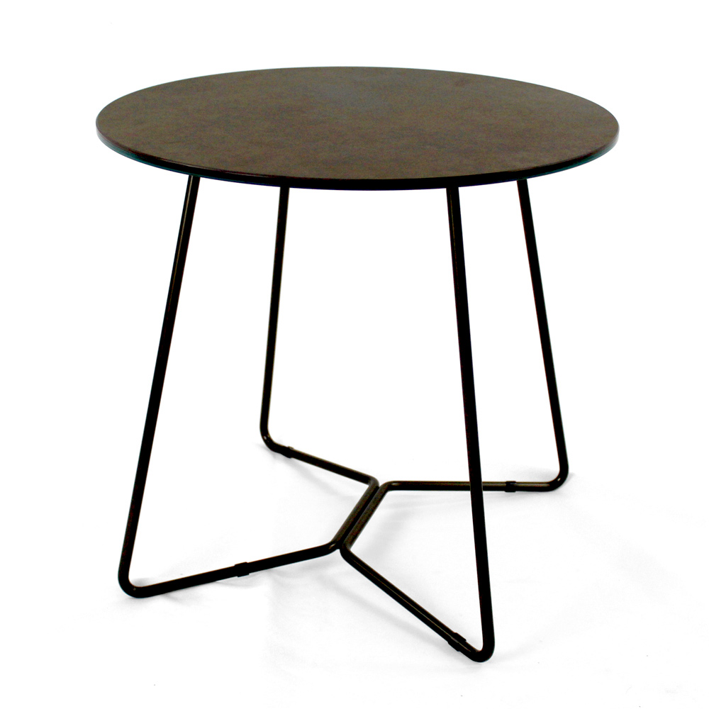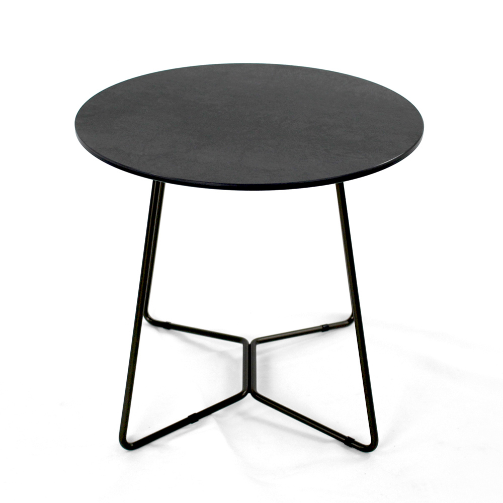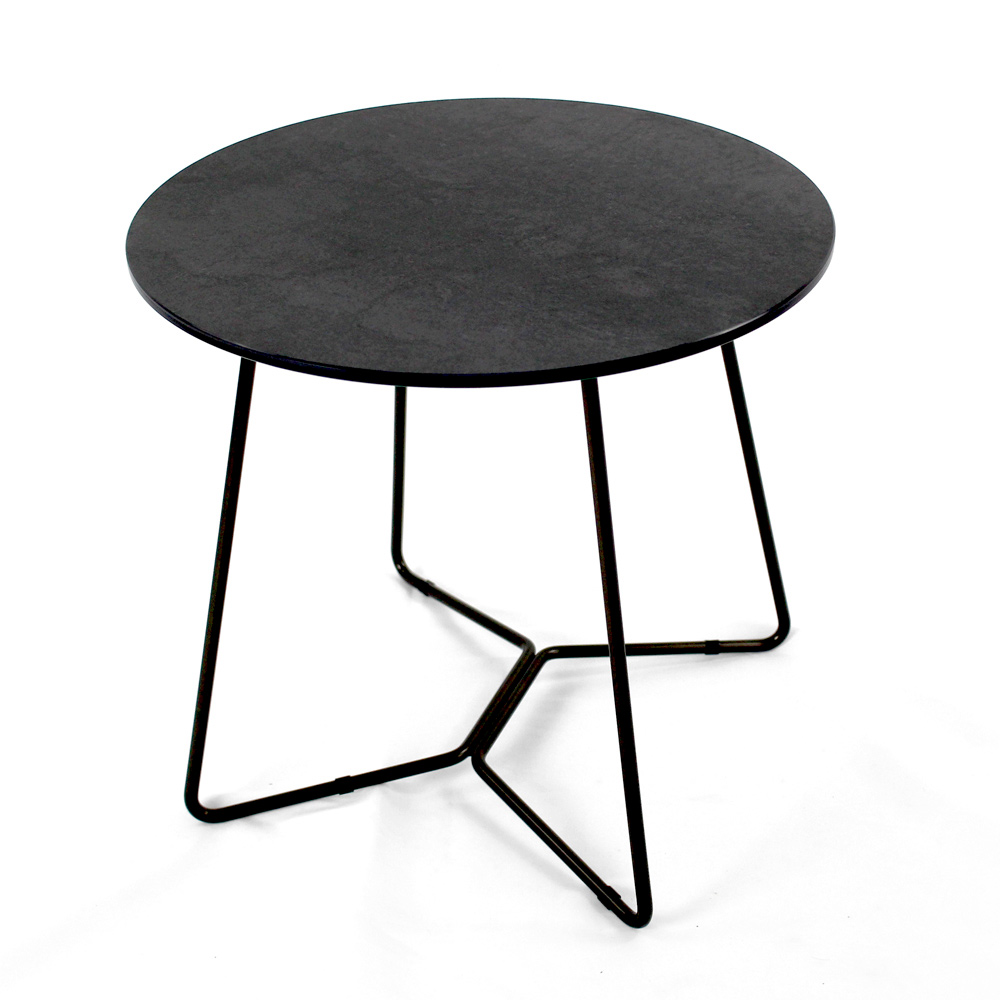 Rundt sofabord med understel af malet stål og top af porcelæn i stentøj.