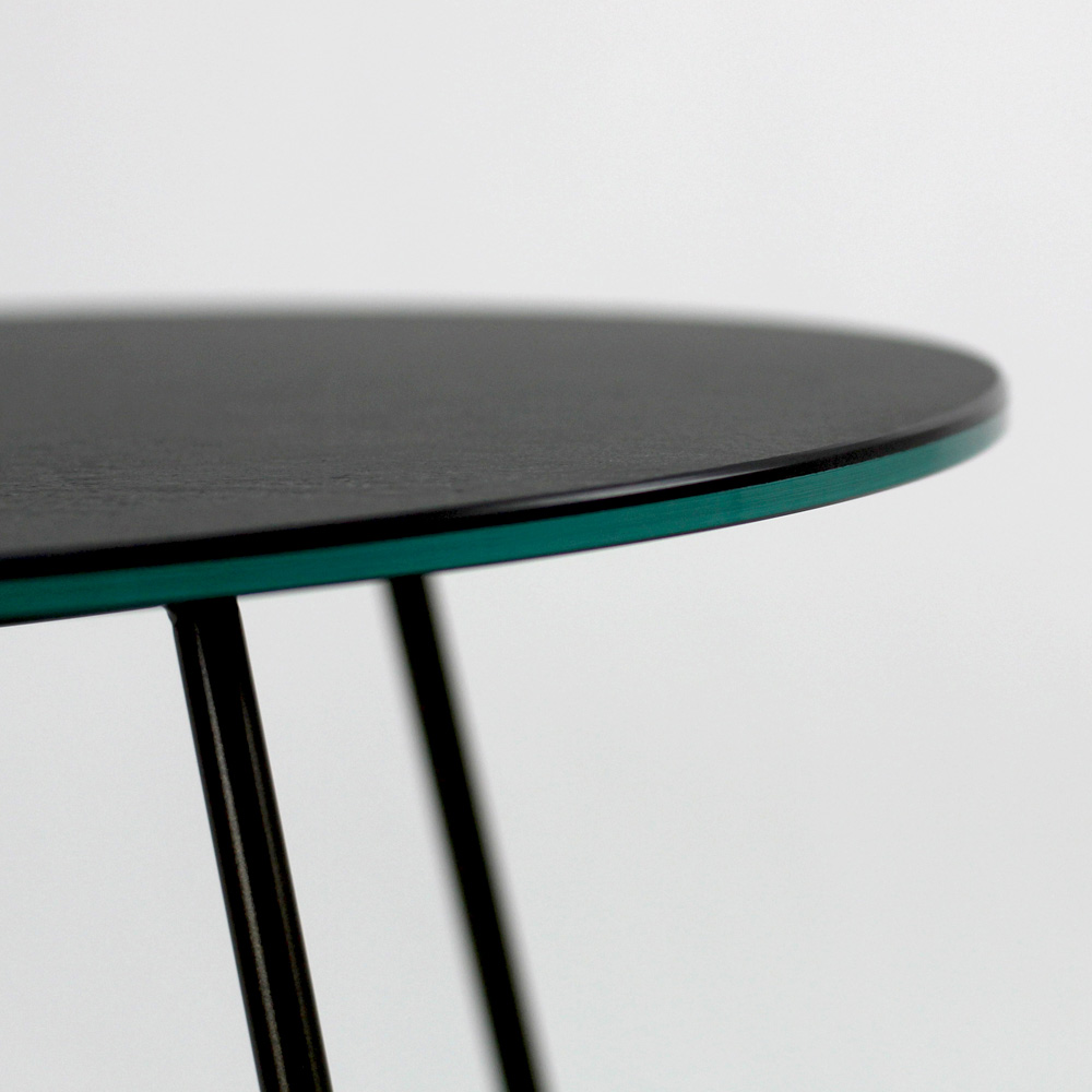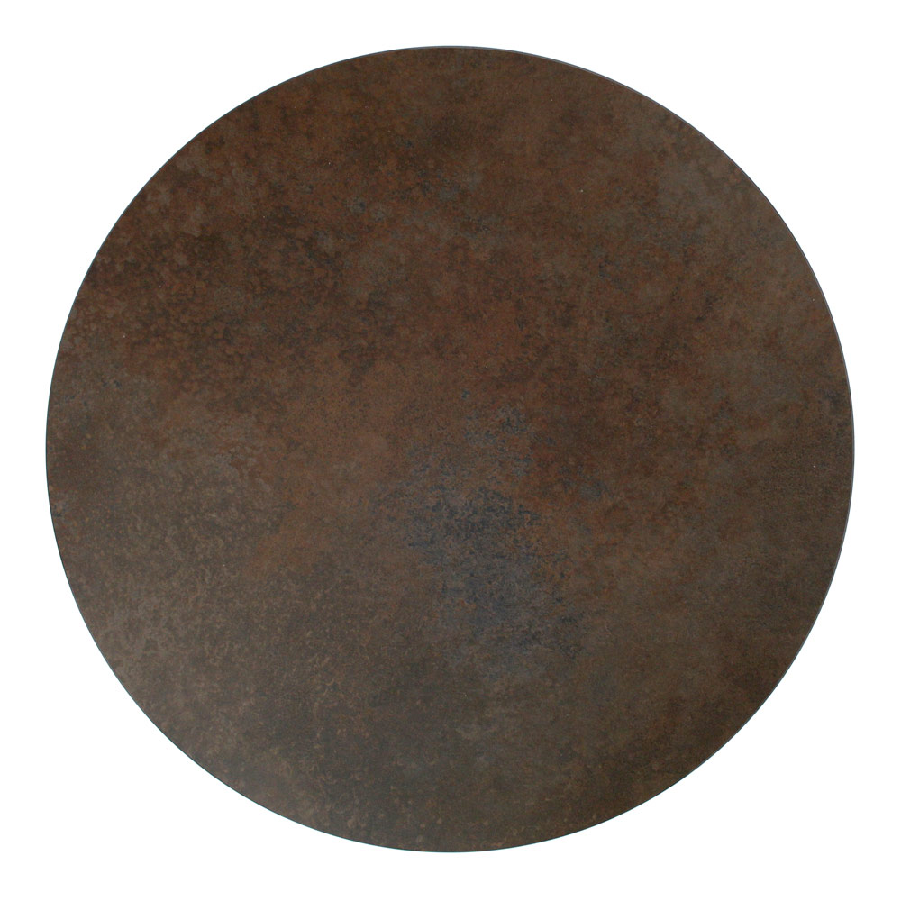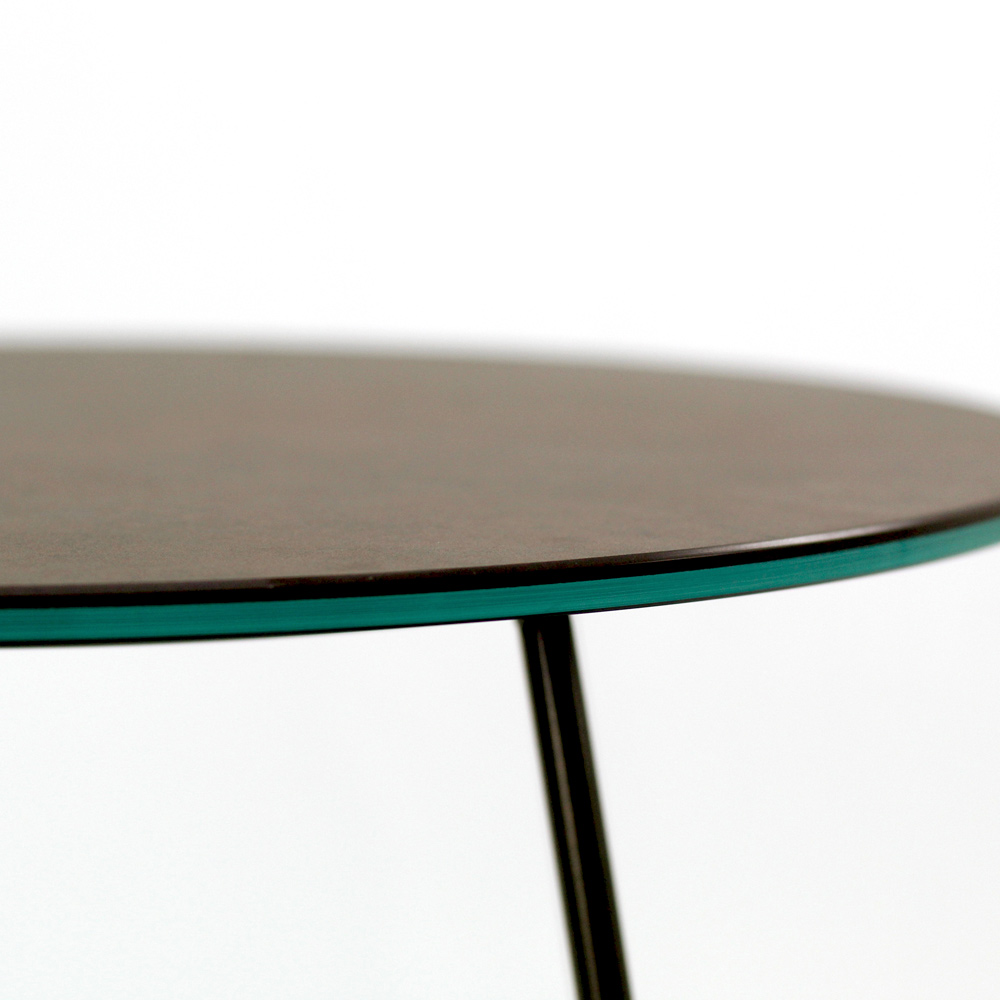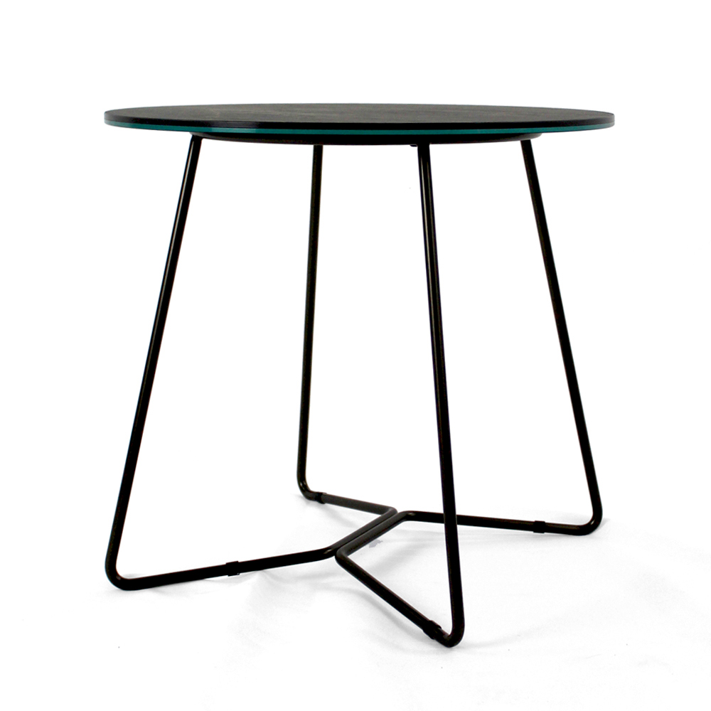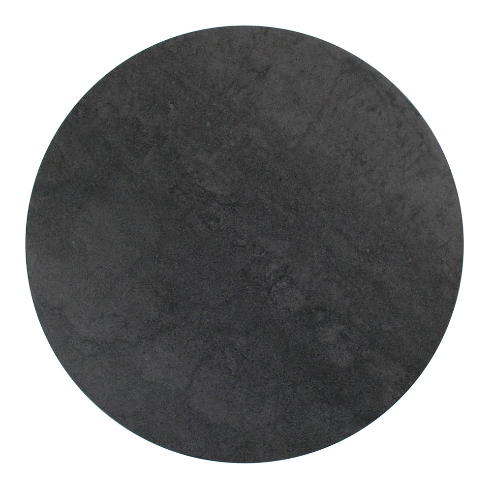 Rundt sofabord med understel af malet stål og top af porcelæn i stentøj.
