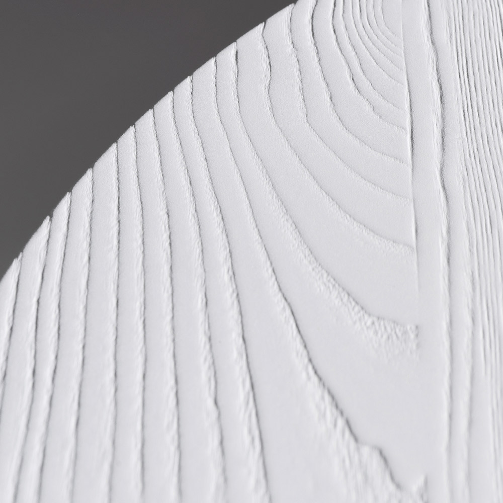 Bordet er fremstillet af varmebehandlet askefiner og fremhæver træets naturlige årestruktur, hvilket forstærker dets teksturerede karakter og kromatiske dybde. Det fås også i sort eller hvid lak , hvilket gør det alsidigt nok til at passe til en række forskellige stilarter, fra minimalistiske til dristige og grafiske.