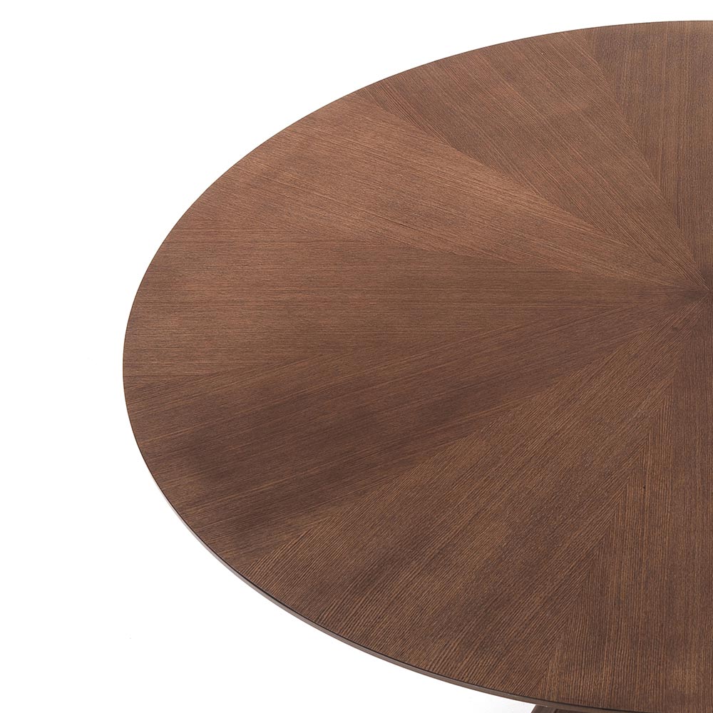 Spisebord med rund MDF-plade og stel af massivt træ.