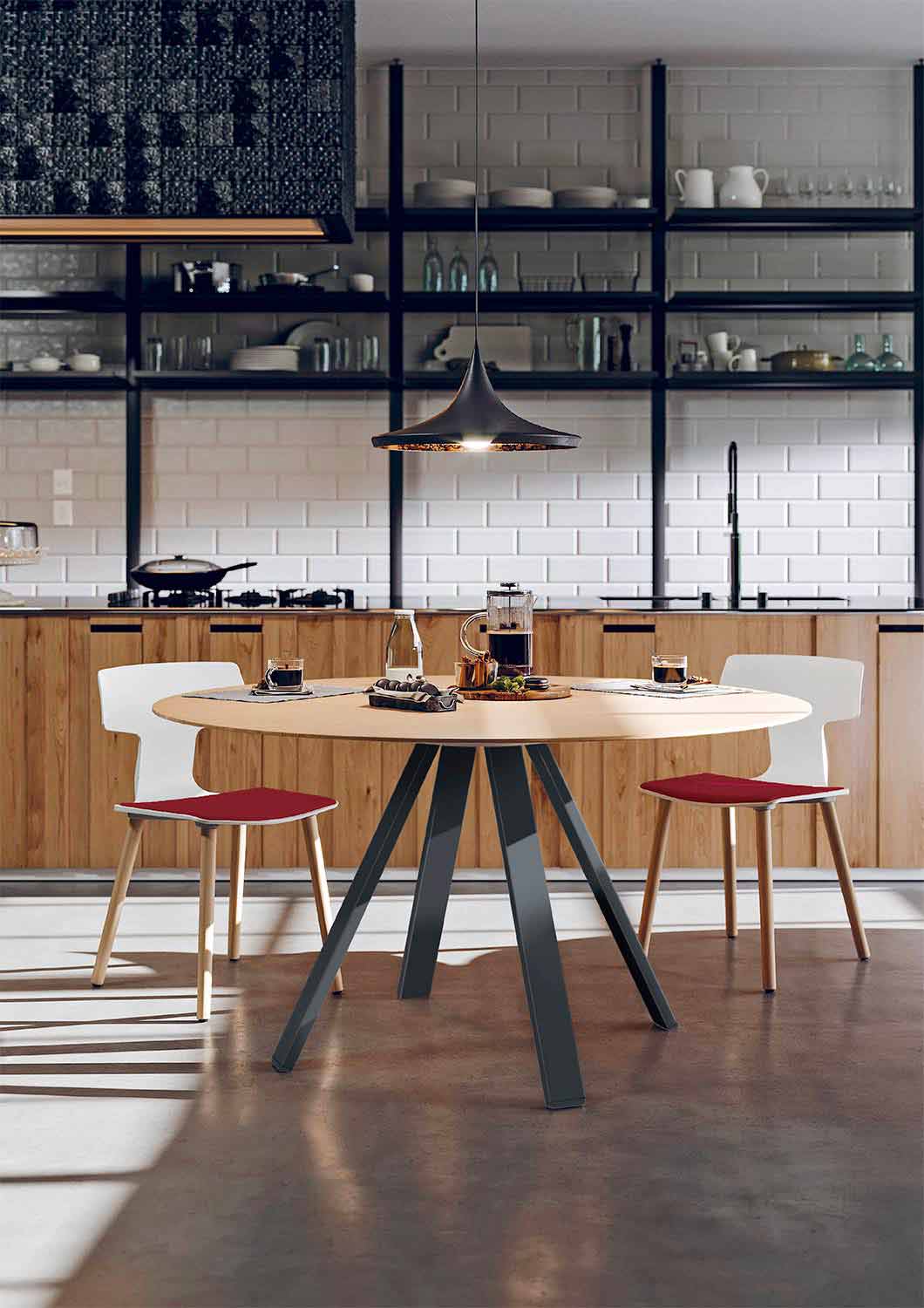 Dette spisebord er kendetegnet ved en hvid eller sortmalet metalstruktur bestående af 4 ben arrangeret i et solbrændingsmønster, der giver mulighed for stabilitet og robusthed . Basen tillader også bordet at få elegance og alsidighed, hvilket gør det nemt at kombinere med enhver møbelstil. Toppen er lavet af eg-farvet MDF og fås i 2 forskellige diametre til perfekt tilpasning til ethvert behov.