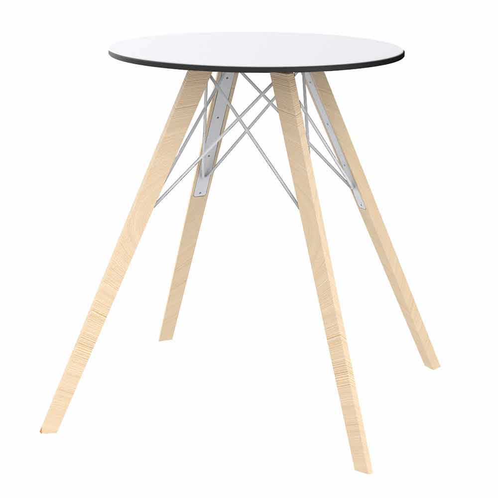 Rundt design spisebord i asketræ og hvid eller sort hpl top og 3 størrelser, 4 stk.