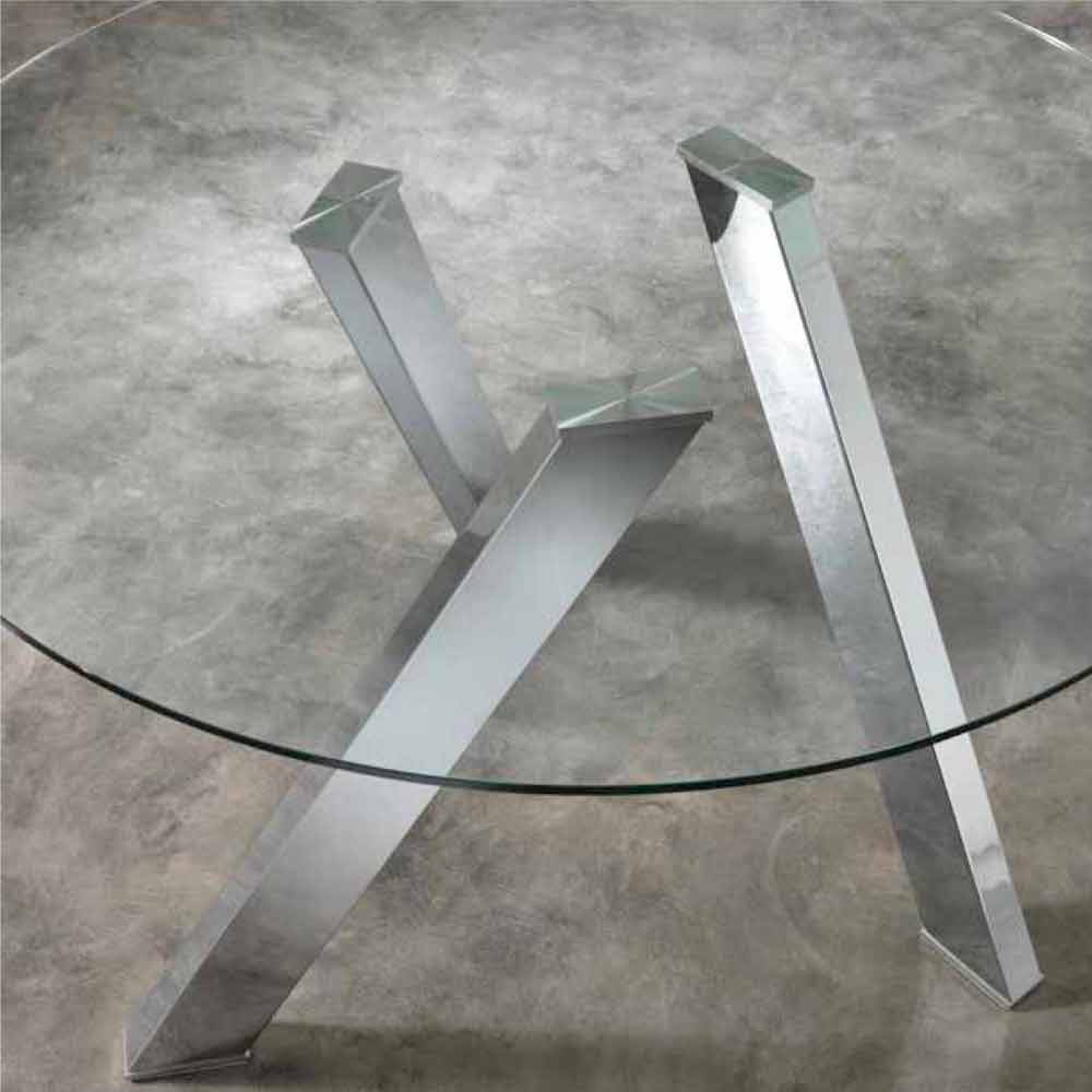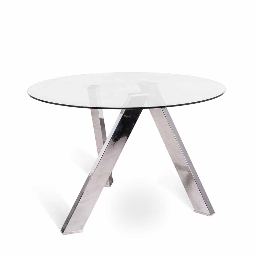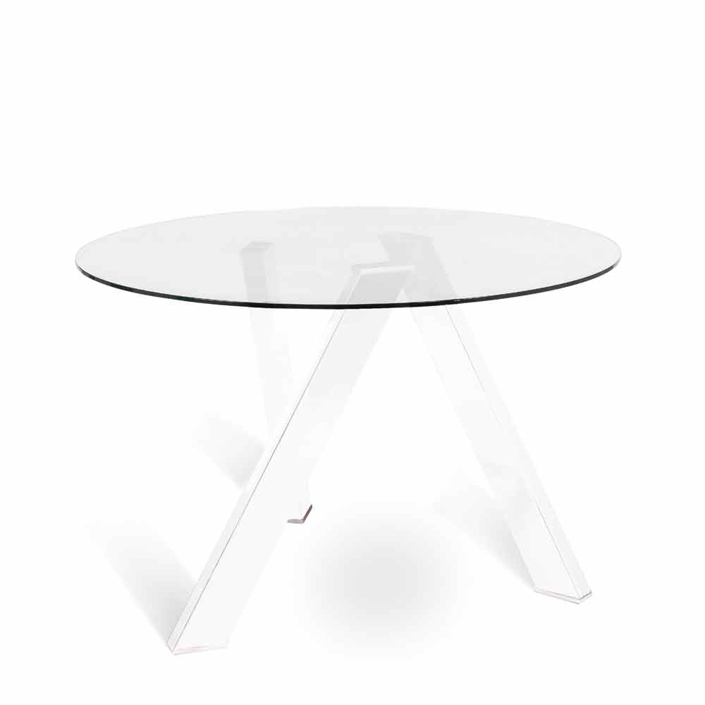 Bord med fod i hvidlakeret metal eller stål og top i gennemsigtigt hærdet glas.