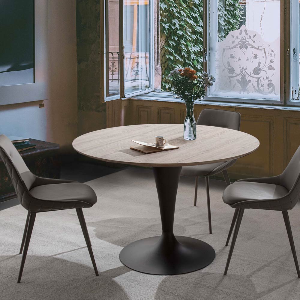 Vidunderligt spisebord med rund plade i belagt lamineret træ (h 30 mm), struktureret egetræsfinish med udvidet kant i MDF og base i sortlakeret stål . Elegance og funktionalitet er de nøgleord, der bedst beskriver dette moderne møbel, der inkorporerer et ekstremt moderne look, der kan berige æstetikken i rummet, samtidig med at de opretholder ret små dimensioner og derfor viser sig at være ideelle for dem, der har begrænsede pladser til rådighed, men ikke ønsker at give op møblering dem på en sofistikeret og stilfuld måde. Denne tabel er ideel til at fuldføre ethvert miljø med ædruelighed og er også ekstremt alsidig takket være den perfekte kombination af enkle og vigtige overflader.
