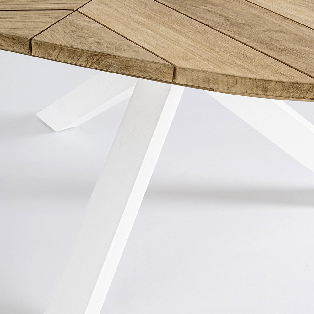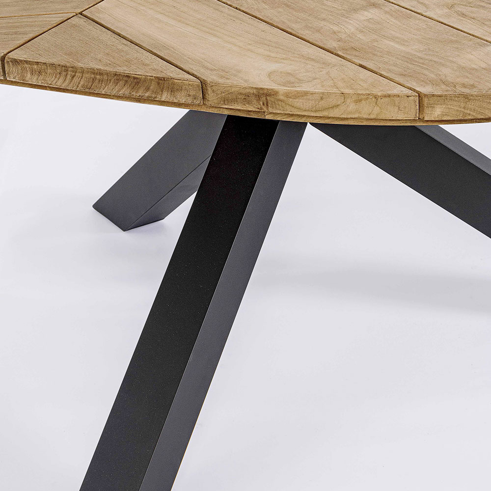 Rundt udendørs spisebord i aluminium med top i kvalitets teak træ.