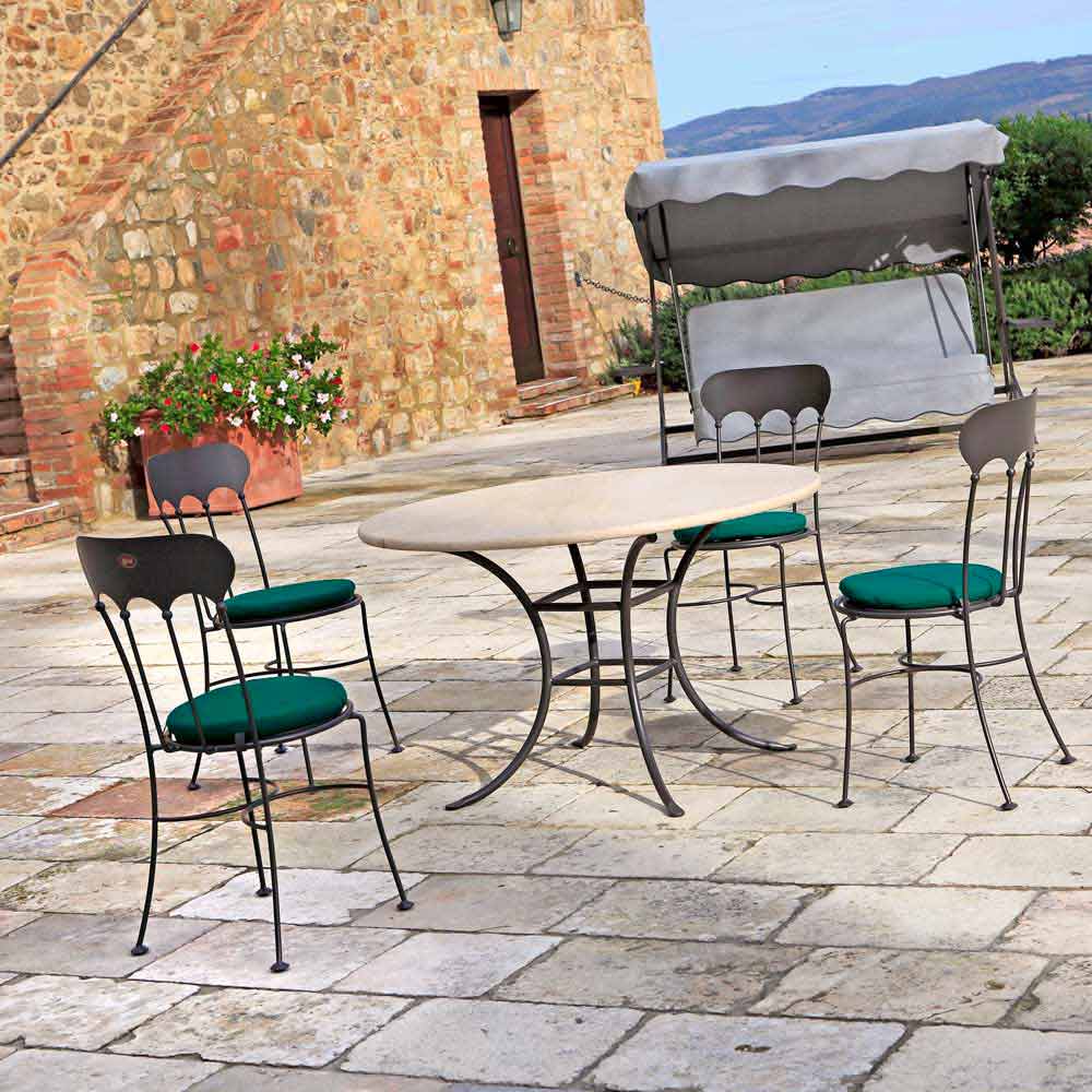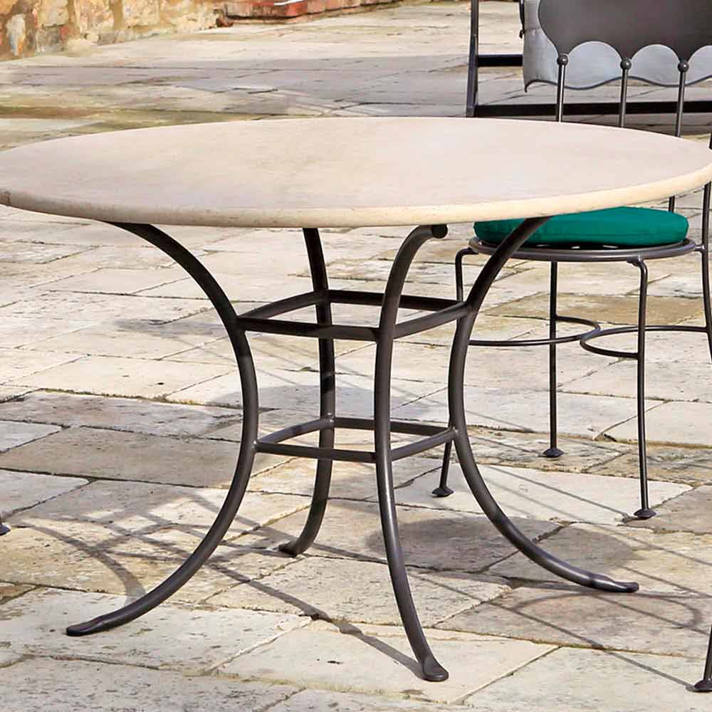 Udendørs spisebord fremstillet i Italien med antracit finish malet jernbase og rund top i let travertin . En indretningside, der minder om en mere klassisk stil takket være brugen af materialer og finish med en gammel sjæl. Strukturen giver produktet optimal stabilitet, mens varmforzinkningsbehandlingen gør det særligt modstandsdygtigt over for enhver form for korrosion, hvilket garanterer metalets rustfasthed i årtier og beriger dets æstetik med en belægning med en ru struktur, der forbedrer den gamle smag af dens formularer. Det 100% italienske håndværk sammen med opmærksomhed på detaljer understreger endnu mere dets værdi og værdi og tilbyder dermed et slutprodukt af høj kvalitet, der er karakteristisk for ethvert udendørs rum takket være sin stærke klassiske personlighed og elegance uden travertintoppen, der giver bordet dens gammeldags æstetik.