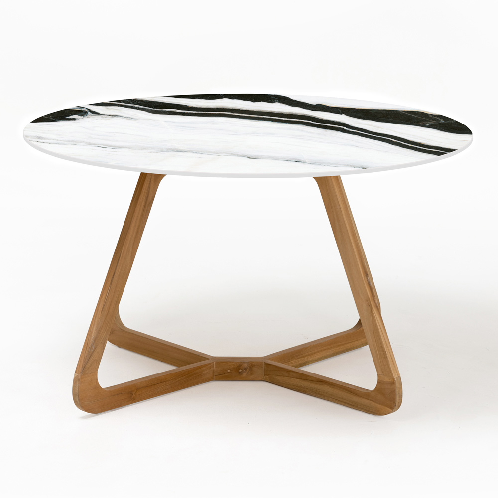 fremstillet i Italien. Dette udendørsbord er et unikt designstykke, der kombinerer træets naturlige skønhed med det praktiske ved moderne keramik. Bordpladen efterligner perfekt Panda White-marmoren, kendt for sine sorte årer mod en ren hvid baggrund, hvilket giver en slående visuel kontrast, der tilføjer et strejf af elegance til ethvert udendørsmiljø.