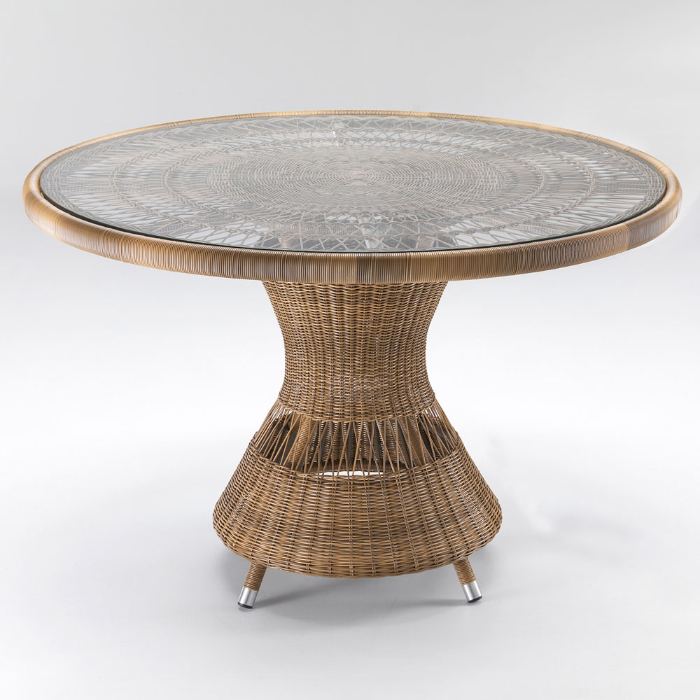 Gigi rundet udendørs spisebord har en struktur med et stel lavet af pulverlakeret aluminium , hvorpå det er håndvævet af de dygtigste håndværkere i Rehau-mærket Polyrattan fiber af høj kvalitet med en tykkelse på 3 mm. Derudover er bordet udstyret med en 8 mm tyk glasplade, som lader den håndvævede roset skinne igennem.