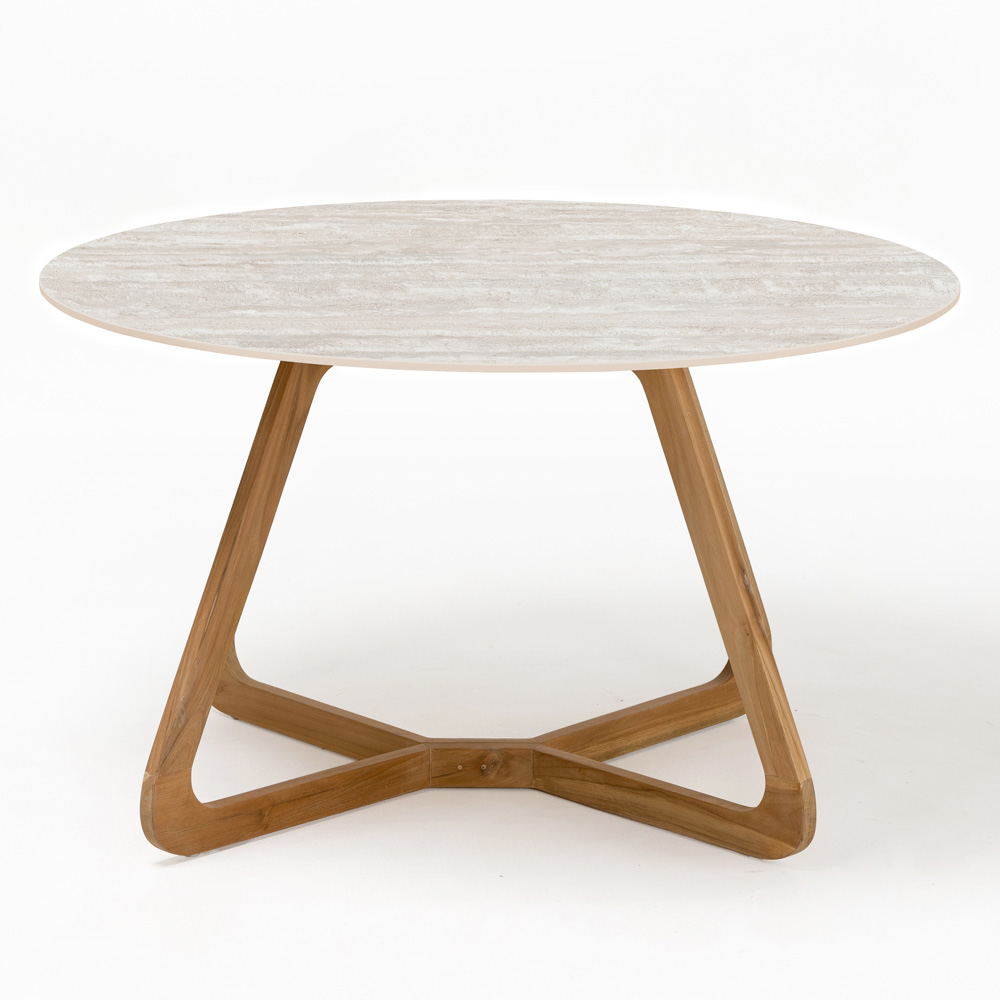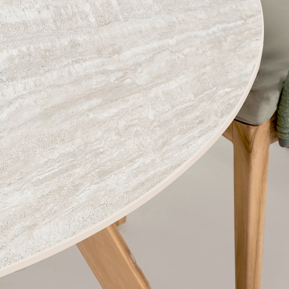 fremstillet i Italien. Dette udendørsbord er et upåklageligt valg for dem, der værdsætter skønheden ved tidløse naturlige finish. Det kombinerer en keramisk bordplade inspireret af lys travertin med en træbase, hvilket skaber et udendørsmøbel, der er lige så funktionelt, som det er æstetisk tiltalende.