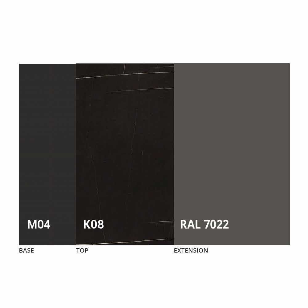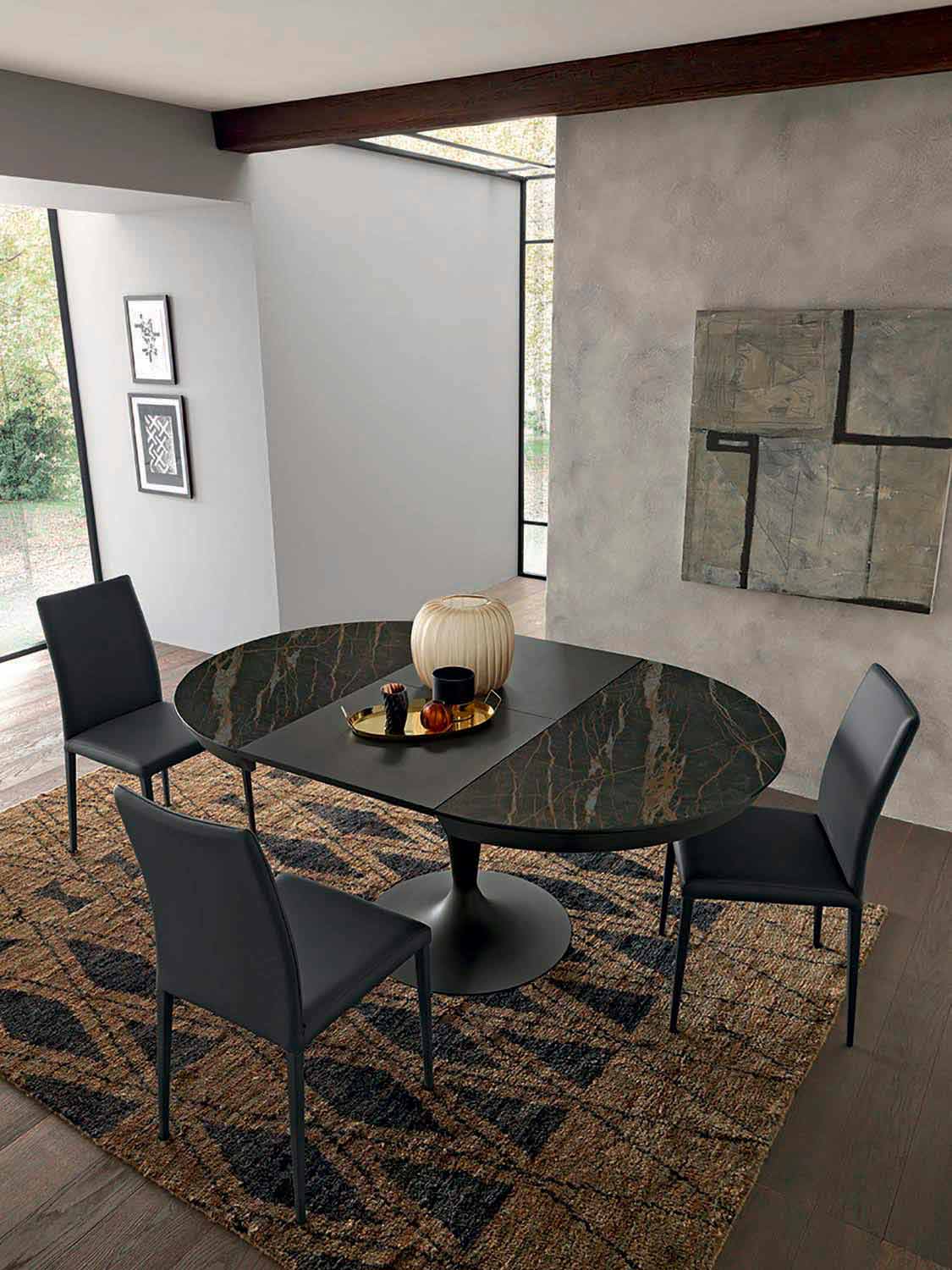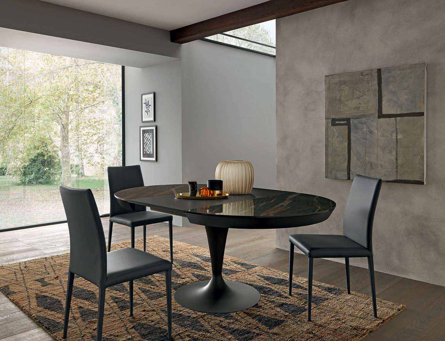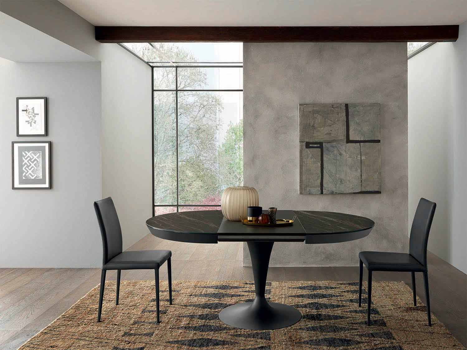 Udtrækkeligt design spisebord med rund laminam keramisk plade og metalbund Made in Italy.