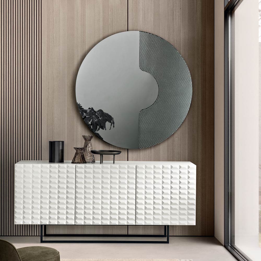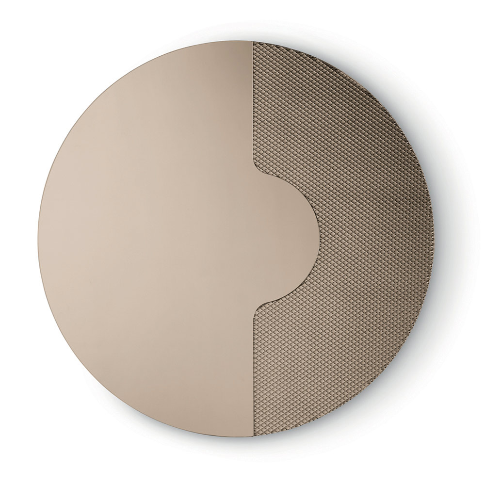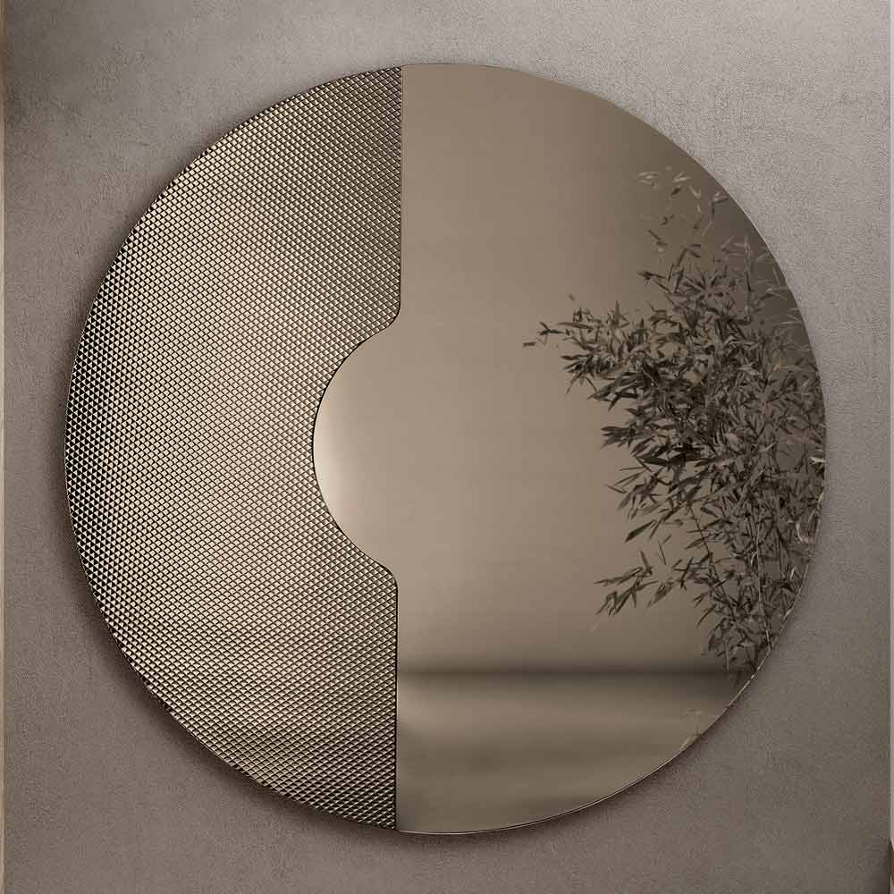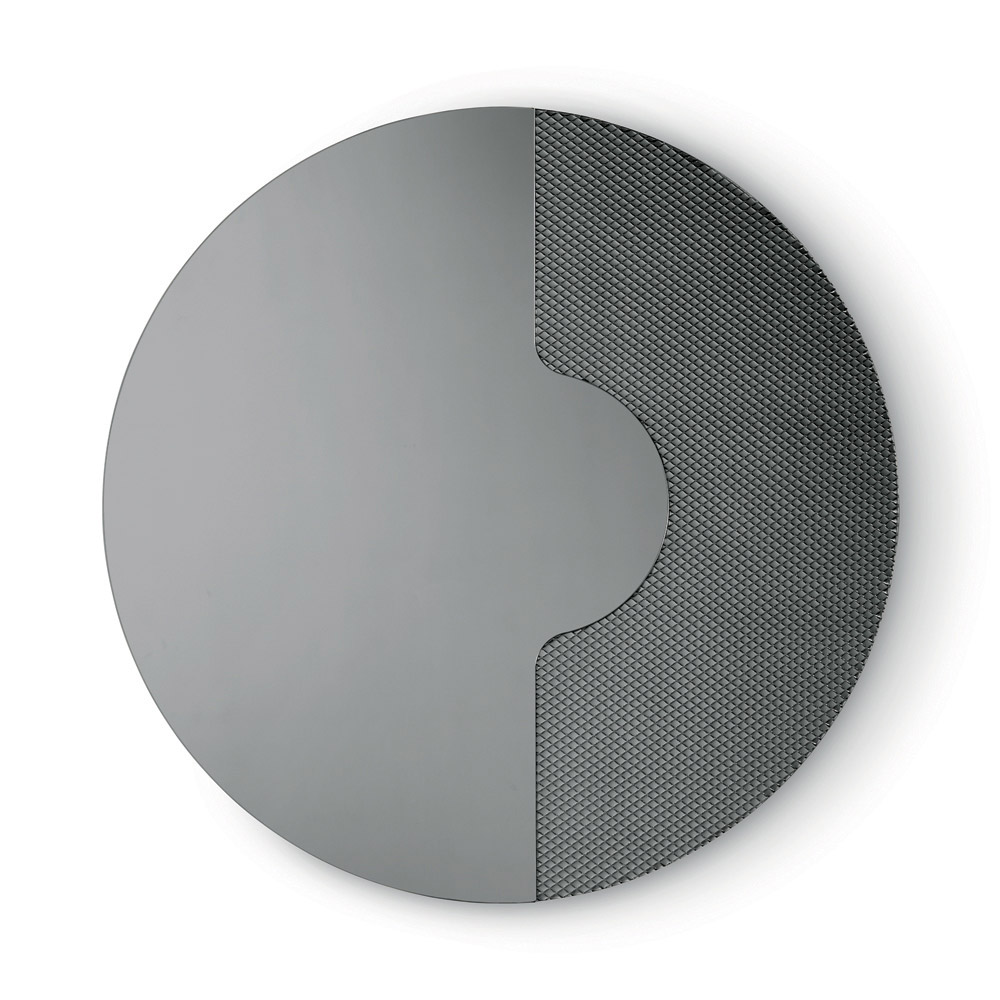 Det runde spejl har en sideindsats i tone-i-tone-glas graveret med et grafisk netmønster . Dette dekorative element holder spejlpanelet, som om det hviler på det, hvilket skaber en raffineret tredimensionel effekt og et elegant samspil mellem tykkelser og refleksioner.