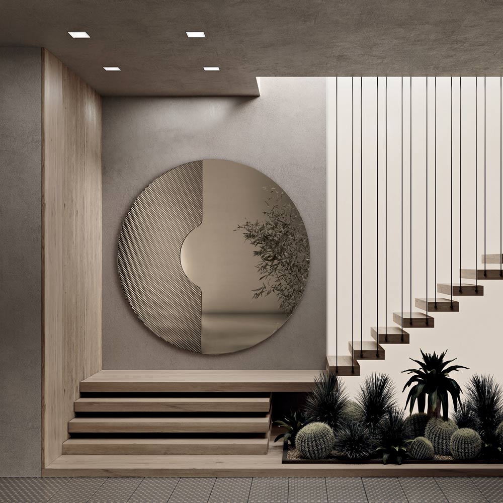 Takket være sin balance mellem geometri og tekstur bliver dette spejl et sofistikeret dekorativt element, der er i stand til at tilføje dybde og lysstyrke til væggen og tilpasser sig perfekt til moderne og nutidige miljøer.