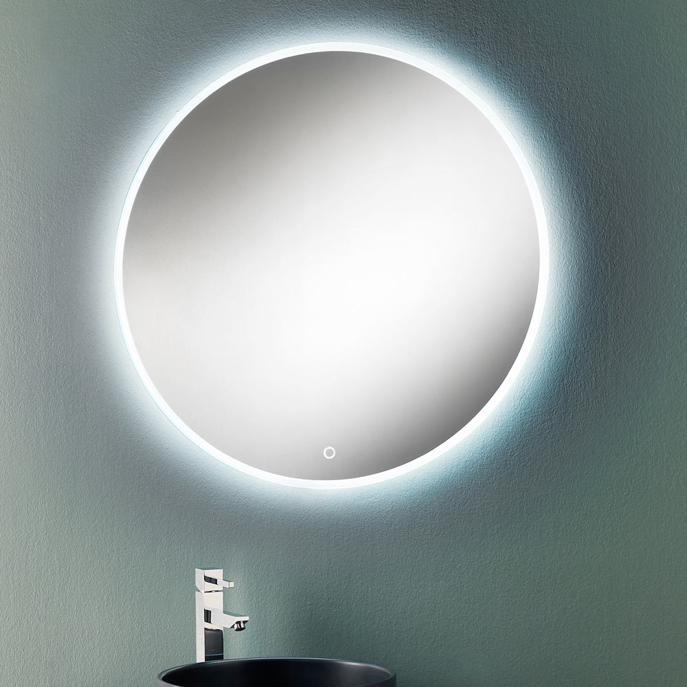 Badeværelsesspejl med rund væg af moderne design med sandblæst og baggrundsbelyst kant, lavet i Italien.