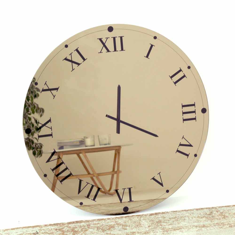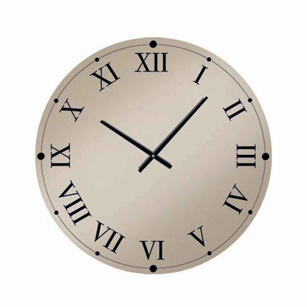 Rundt vægur fremstillet i Italien af spejlet krystalglas med romertal og sorte visere.