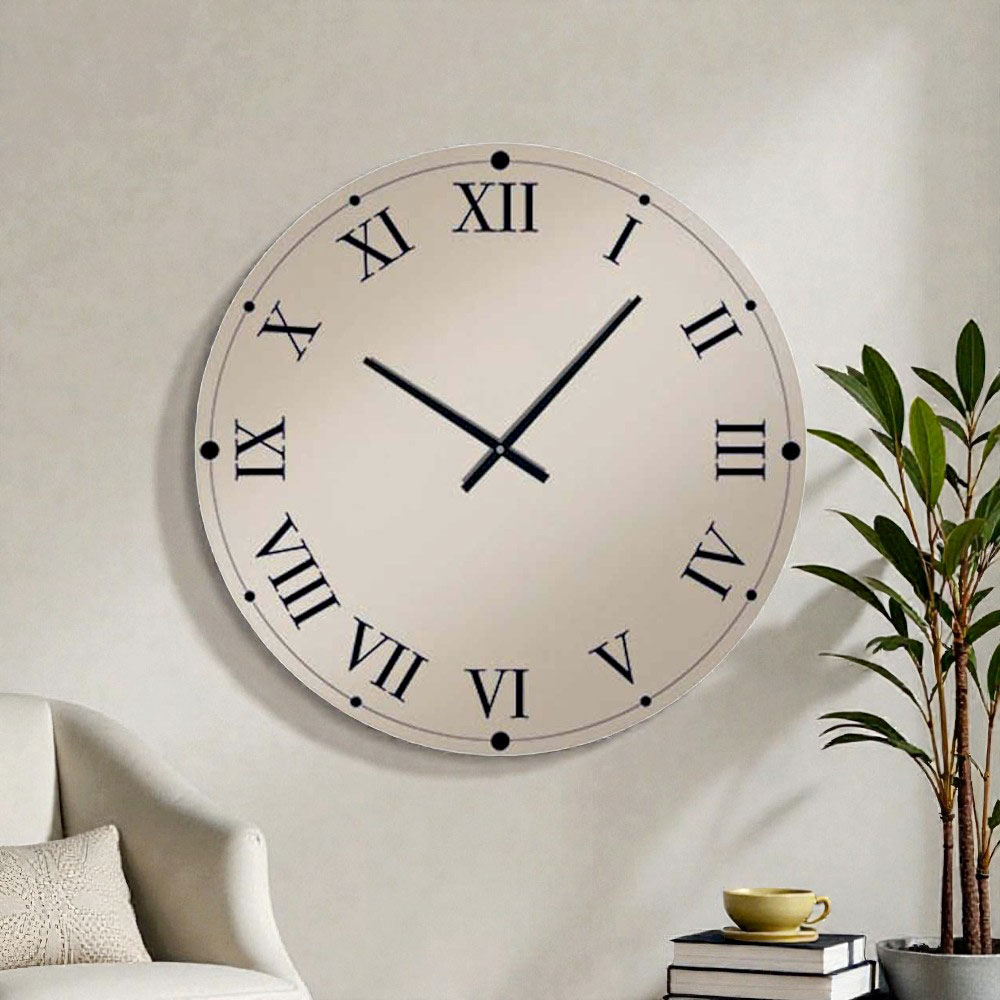 Rundt vægurfremstillet i Italien af spejletkrystalglas med romertal og sorte visere. Brugen af en spejlbelagt finish gør dette møbel til den perfekte fusion mellem et spejl og et rigtigt ur, der udfører en yderst nyttig funktion, samtidig med at det fungerer som en vidunderlig lyskilde, der hjælper med at forstørre rum optisk. Dens design er kendetegnet ved elegance og essentialitet , egenskaber der giver anledning til et elegant element, der er ideelt til de mest varierede moderne miljøer, hvilket giver møblet et personligt og kreativtpræg og øger dets æstetiske værdi.