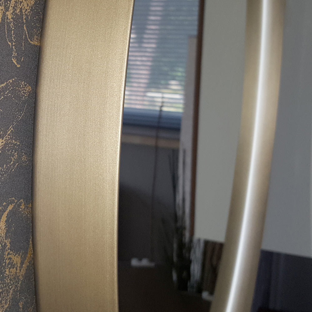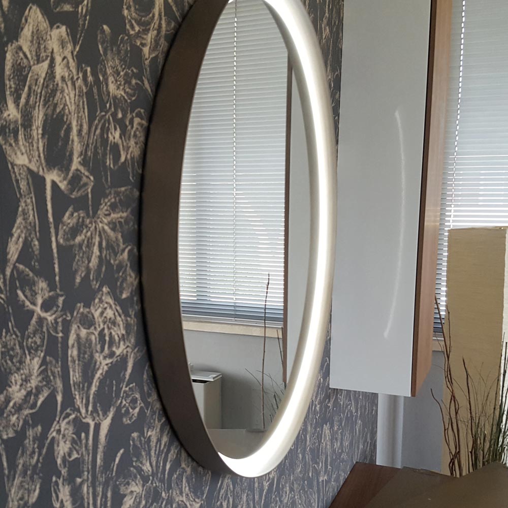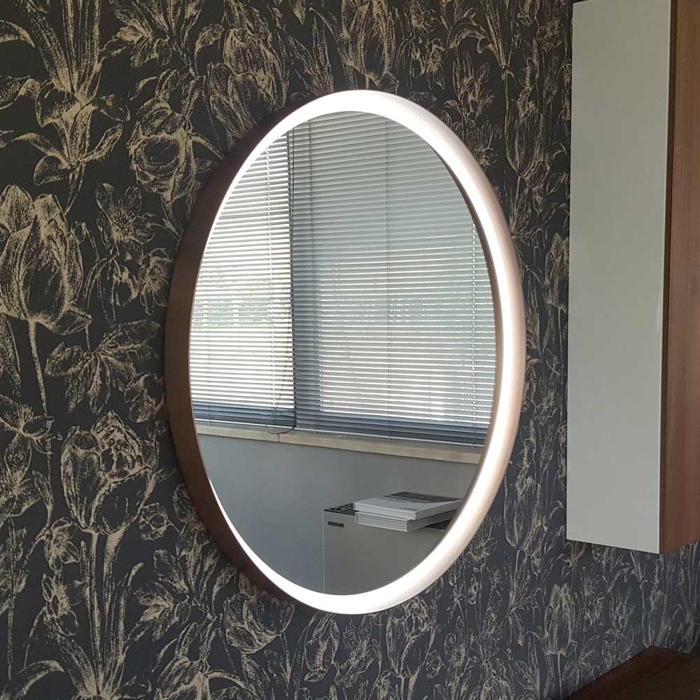 Rundvægsspejl med metalramme i 4 finish og LED-lys, fremstillet i Italien.