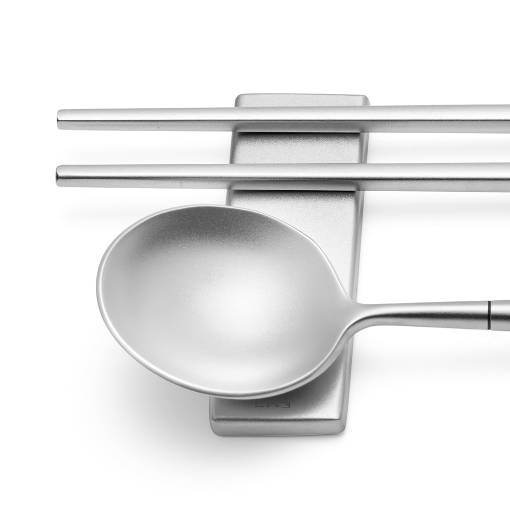 De lange, slanke spisepinde er designet til behagelig brug og et sikkert greb, mens skeen har en optimal dybde til nemt at nippe til bouillon og saucer. Det karakteristiske element er den firkantede base, der fungerer som en hvile for bestik, der sikrer, at det altid forbliver rent og godt præsenteret, når det ikke er i brug.