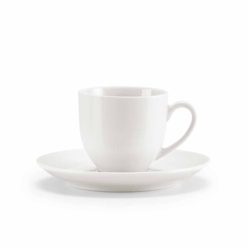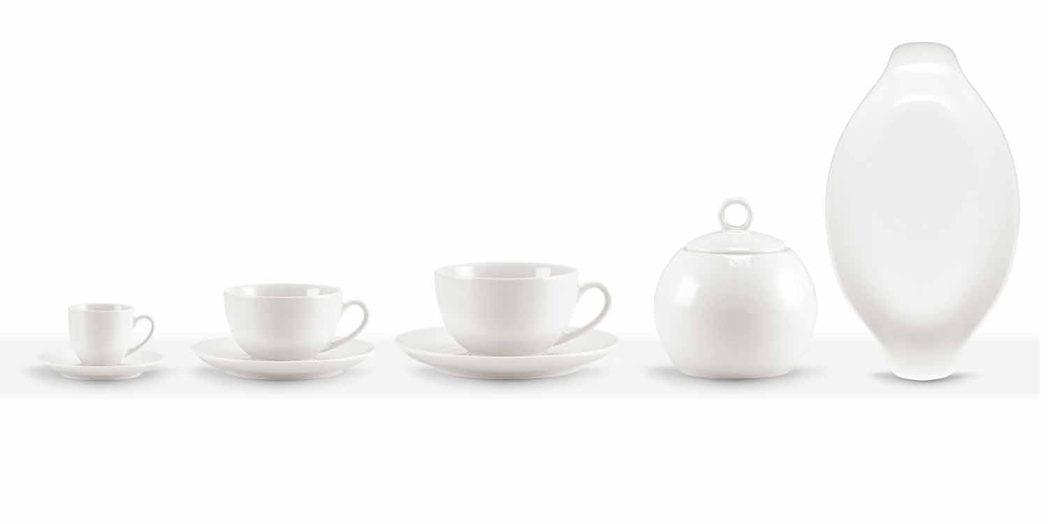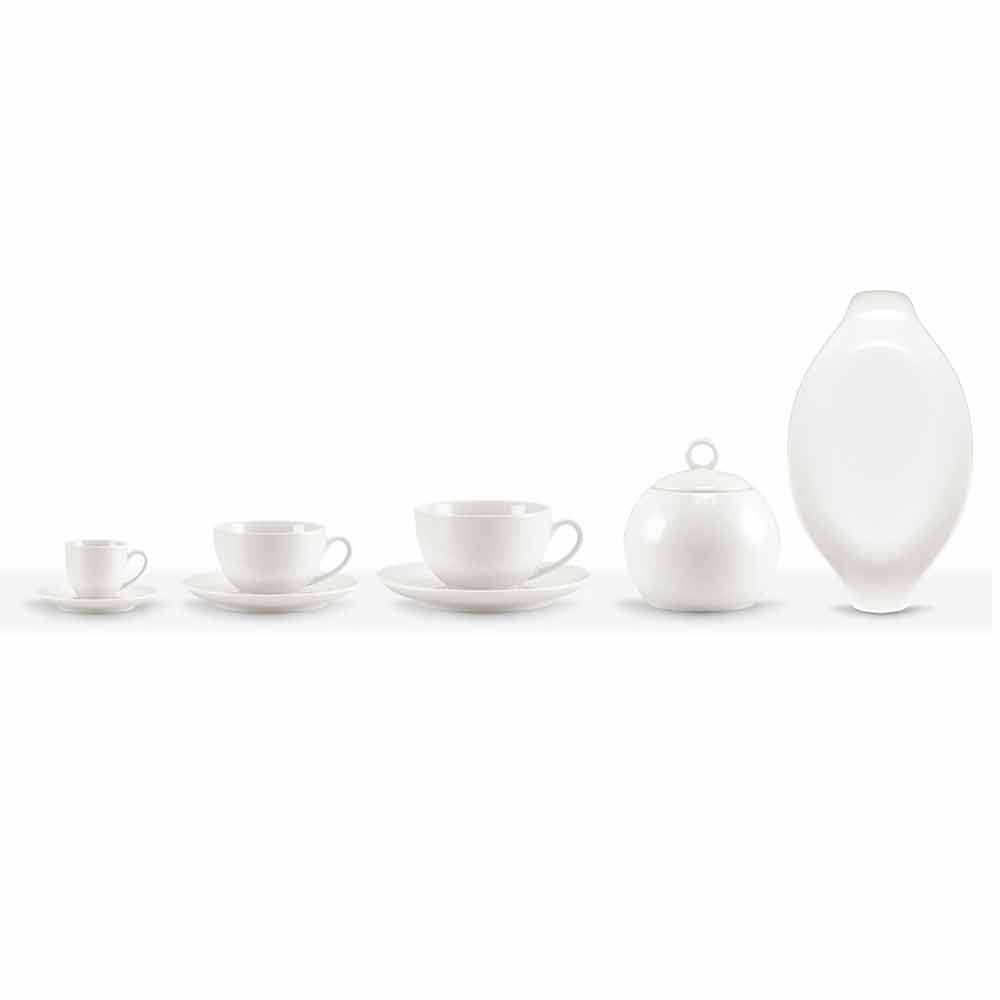 Service af kaffekopper, te, morgenmad med sukkerskål og tallerken med et moderne design i hvidt porcelæn, 20 stykker.