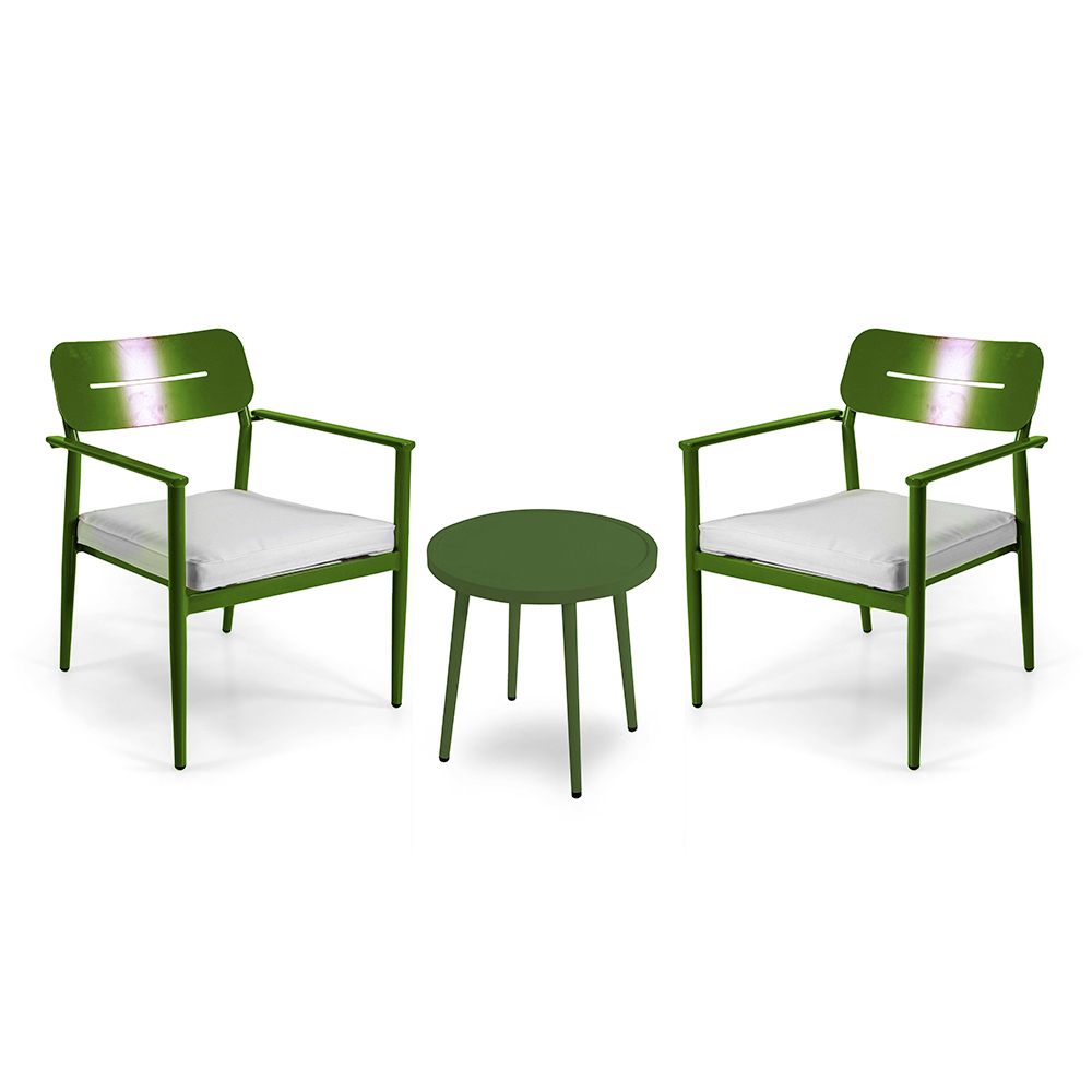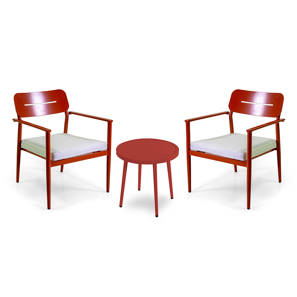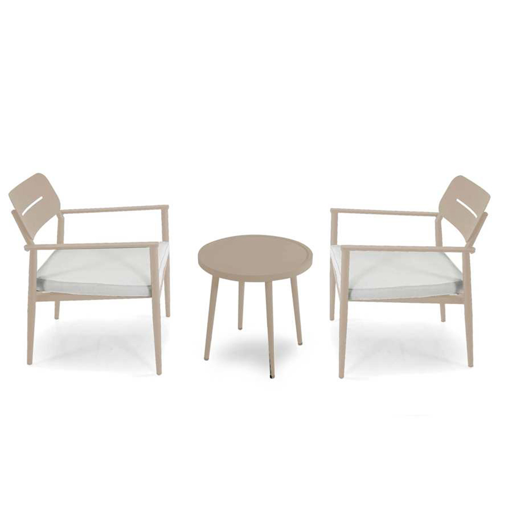 Det koordinerede bord med sit essentielle design fuldender ensemblet og tilbyder en praktisk løsning til at placere drikkevarer eller bøger, hvilket gør dit uderum til en ægte forlængelse af opholdsrummet, ideelt til øjeblikke med afslapning eller til at modtage gæster.