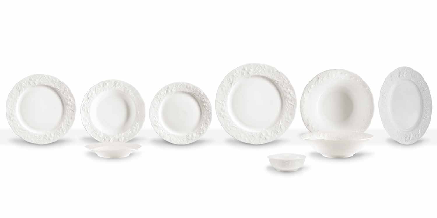 skulpturel elegance i lettelse er nøgleordene for disse kreationer i lyst hvidt porcelæn og en kunstnerisk relieffsdekoration. På den ene side et attraktivt design med flere figurer, på den anden side den charmerende landinspirerede dekoration.