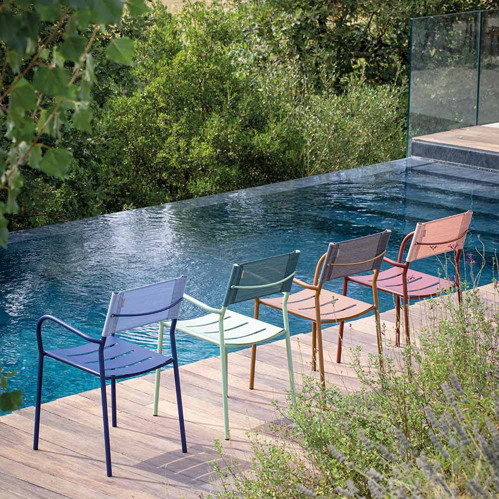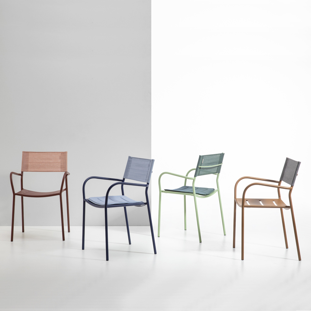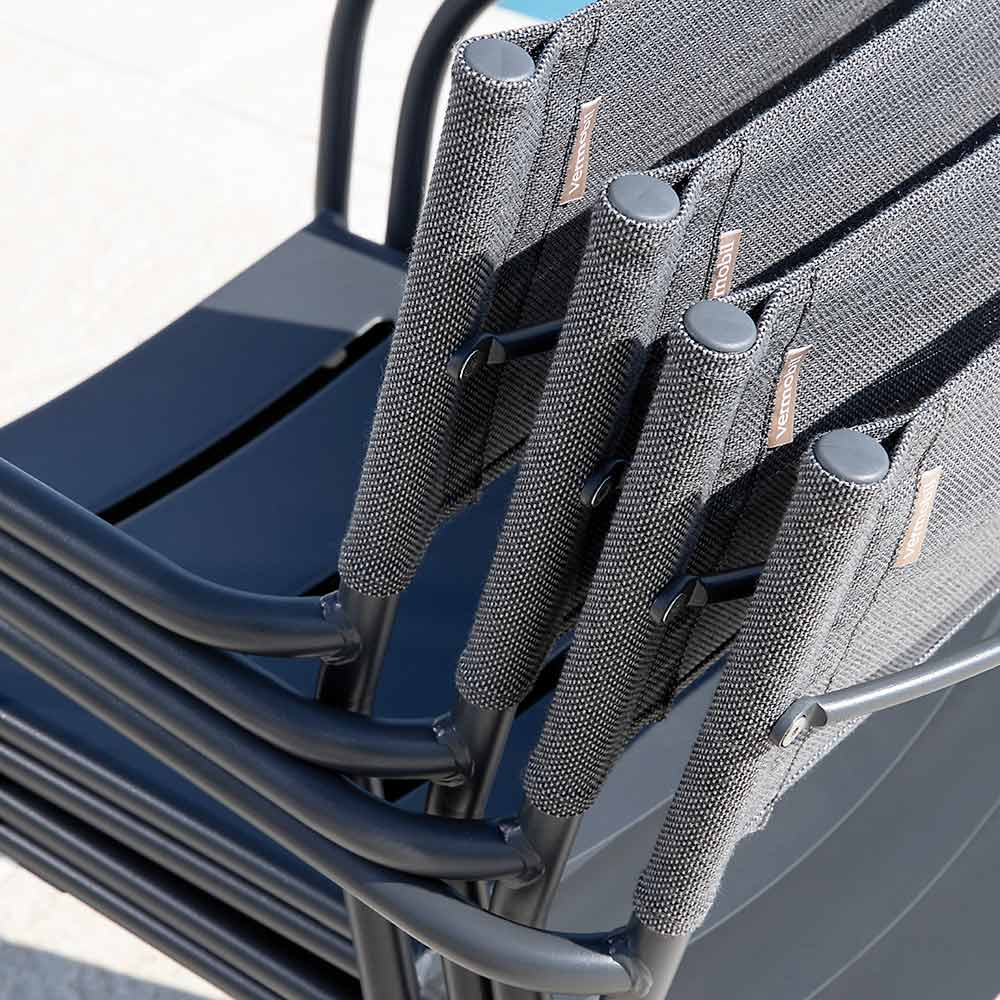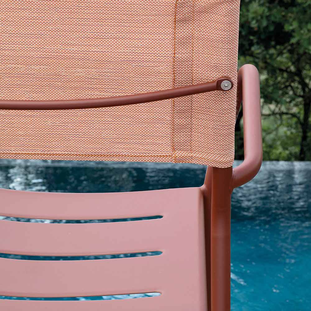 Det ergonomiske sæde med bugtede linjer sikrer fremragende støtte og komfort, mens det åndbare batyline-ryglæn tilbyder overlegen komfort, tilpasser sig perfekt til kroppens form og fremmer luftcirkulationen selv på de varmeste dage. De afrundede armlæn tilføjer et strejf af raffinement, hvilket gør stolen endnu mere behagelig til behagelige afslapningsøjeblikke udendørs.