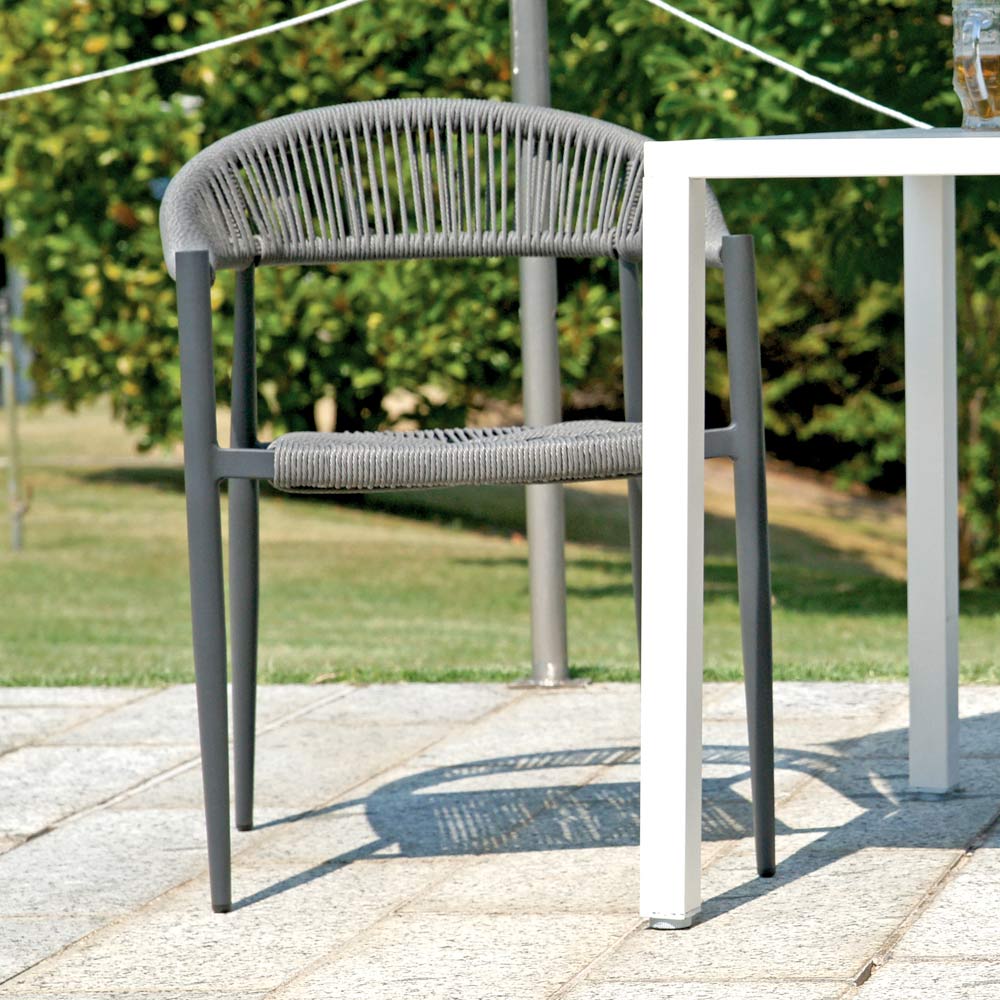 Sædet og ryglænet i 5 mm vridflet giver et naturligt og raffineret præg og skaber en behagelig kontrast til metalstellet. Det vævede materiale tilbyder komfort og åndbarhed, hvilket gør denne lænestol perfekt til afslapning udendørs på varmere dage.