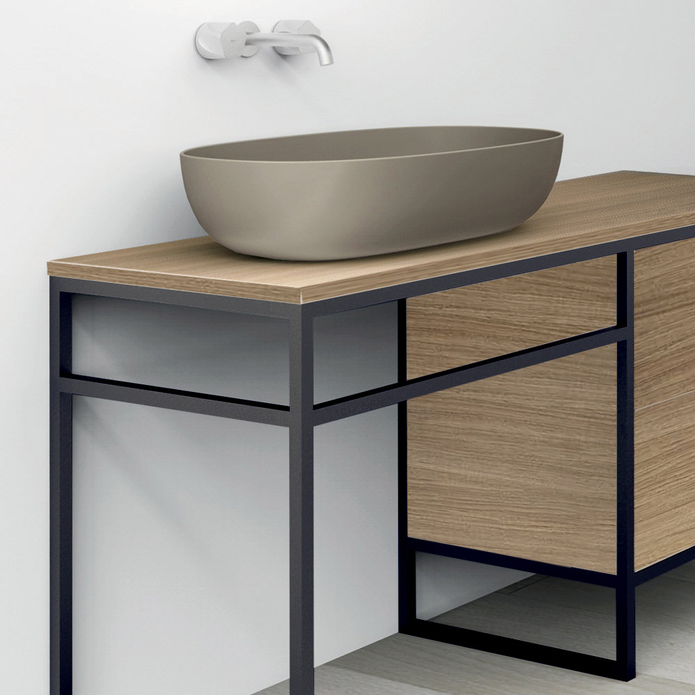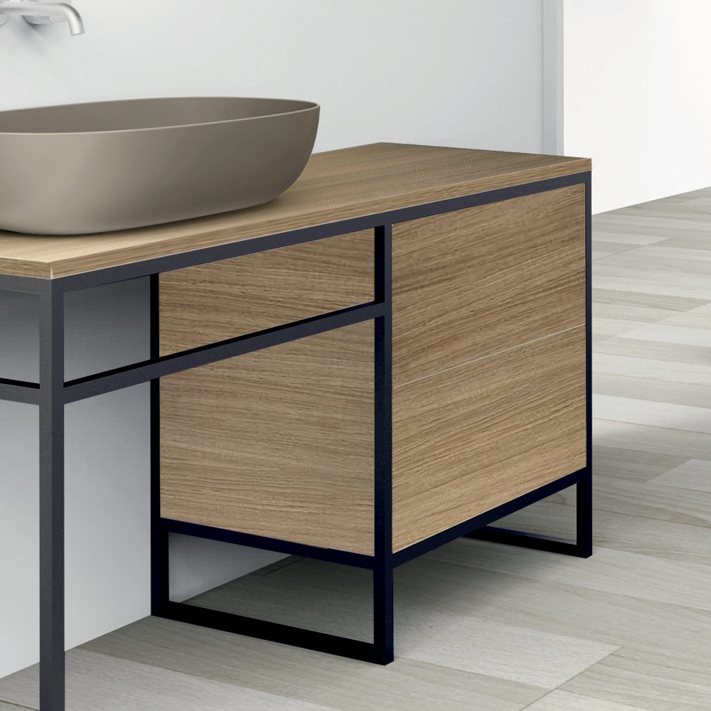 badeværelsesmøbler er kendetegnet ved en struktur lavet med en tynd mat sortlakeret metalprofil, der rammer indvendige døre i øko-træ og skaber en harmonisk kombination af fuldt og tomt rum. Dørens metalfinish fremhæver den
