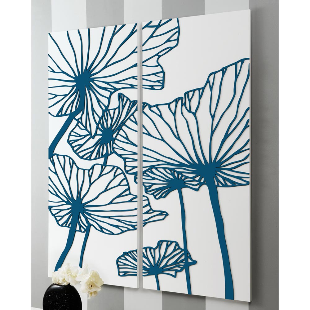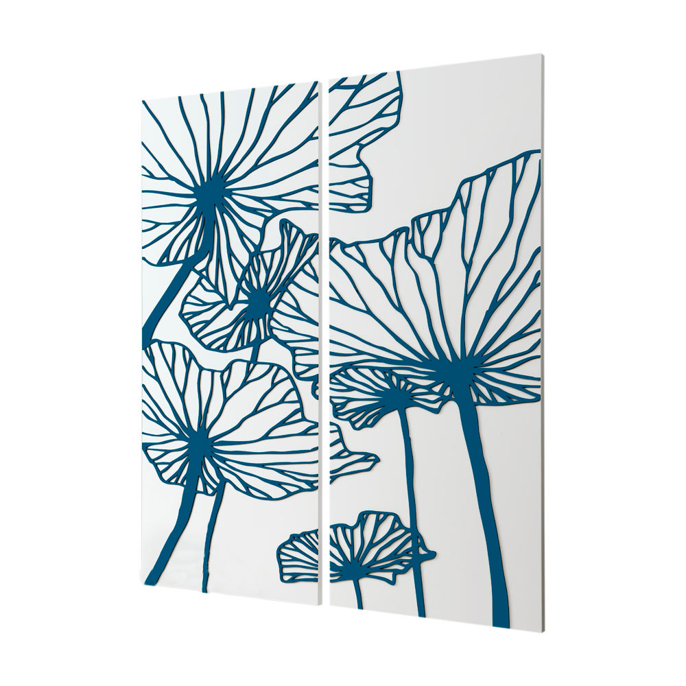 Sammensætning af to paneler i mat hvidlakeret træ med påføring af benzinfarvede trædekorationer, der forestiller kæmpeblomster.