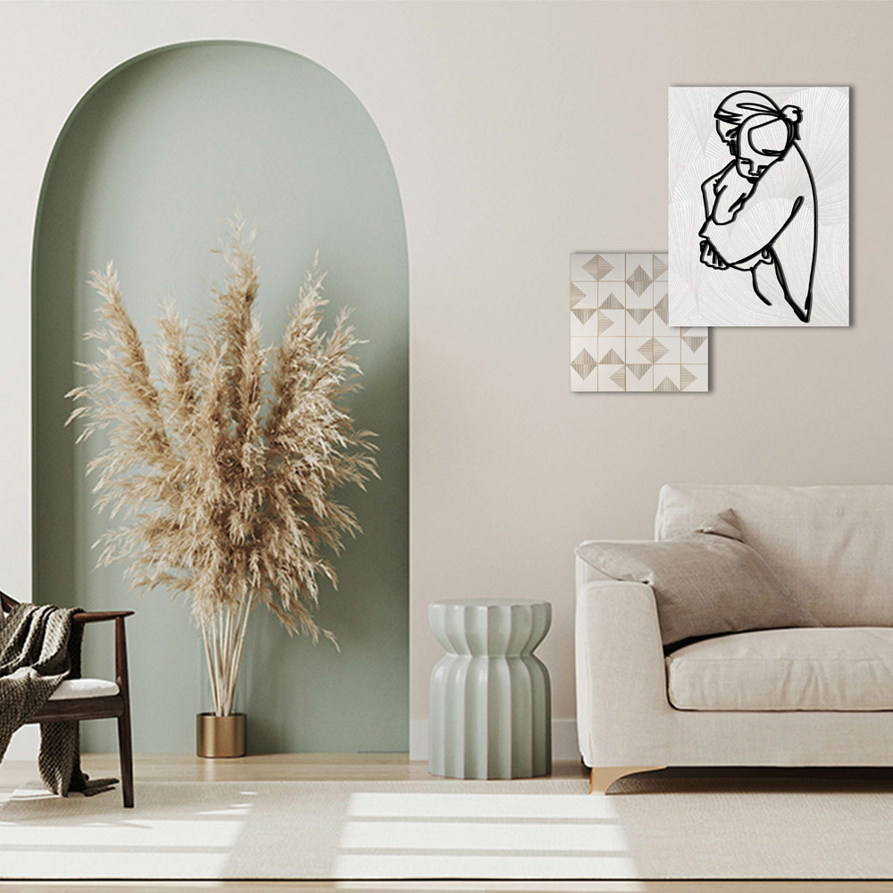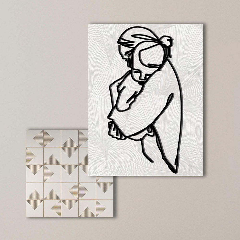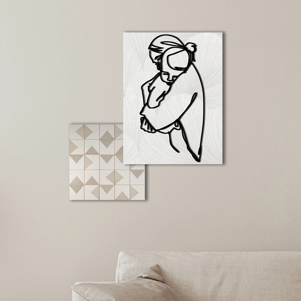 Sammensætning af to paneler i forskellige former og størrelser, der kombinerer laser- og printdekorationer. De to malerier kan placeres på væggen efter ønske, endda hver for sig. Sammensat af 2 trykte træpaneler : den ene rektangulær, der viser en omfavnelse mellem mor og barn, og den anden firkantet med trekantede geometriske motiver.