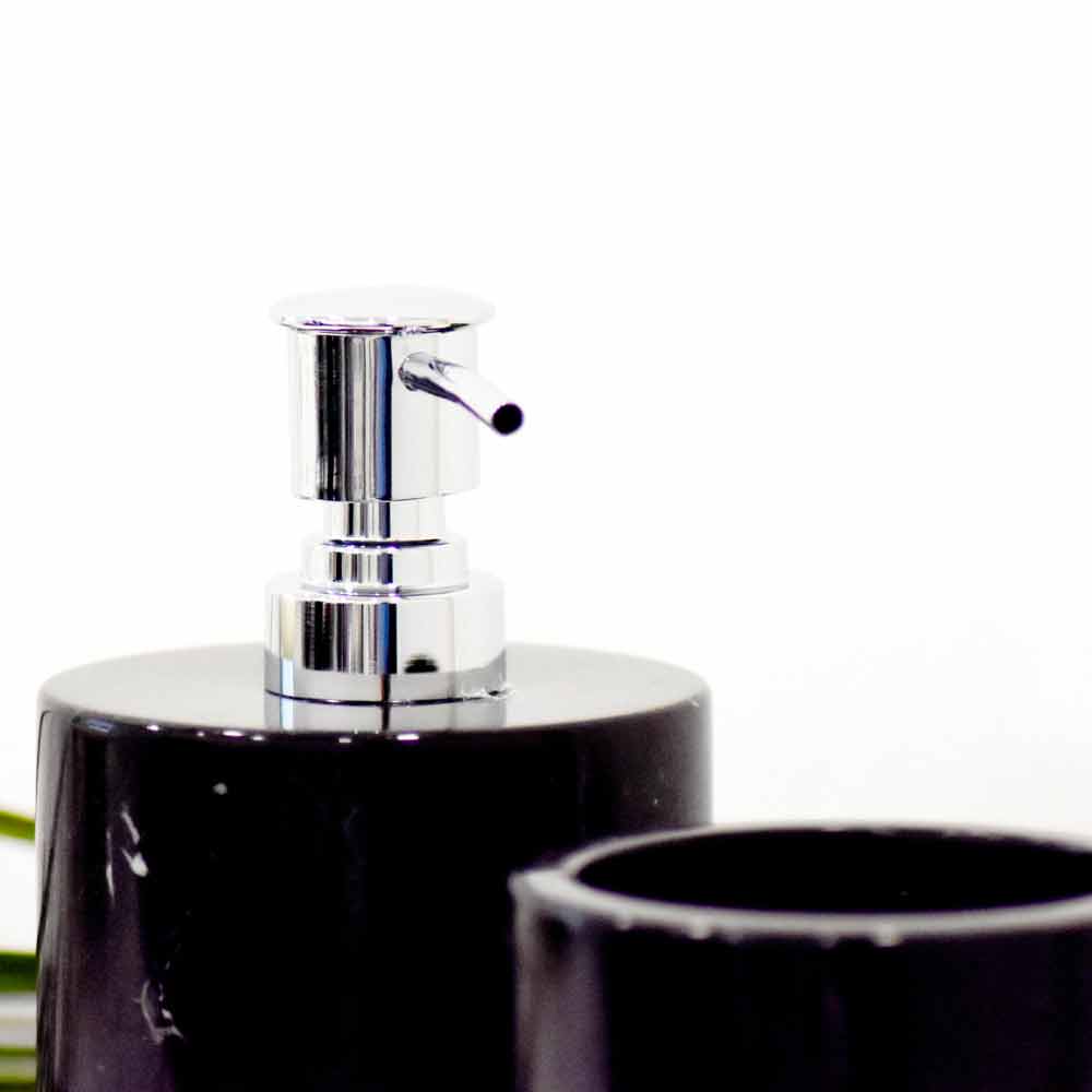 3 badeværelsetilbehør : en tandbørsteholder, en flydende sæbedispenser og en sæbeskål.