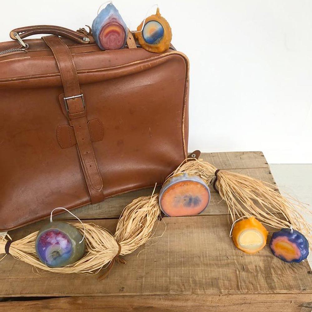 Sammensætning af 3 farvede lys lavet af voks i forskellige håndlavede assorterede farver, unikke stykker, fremstillet i Italien.