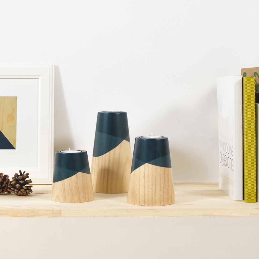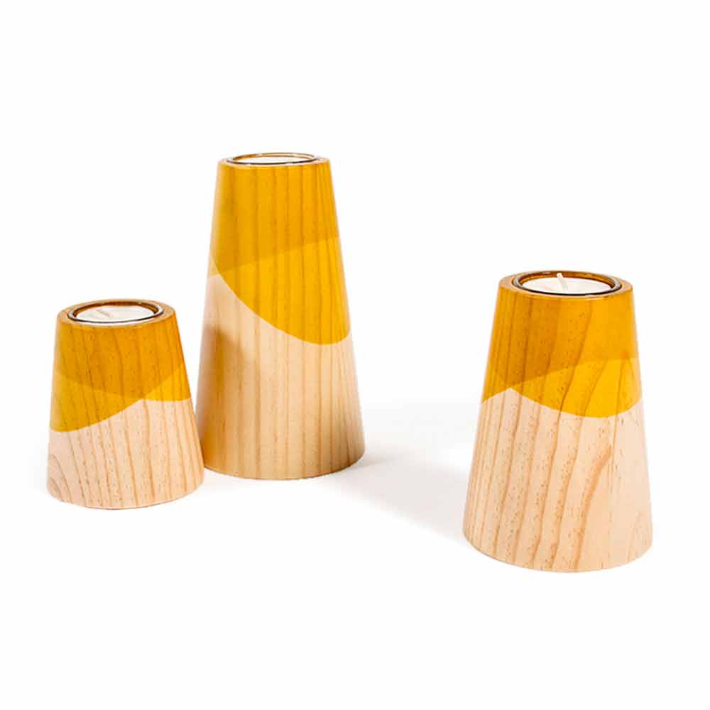 Sammensætning af lysestager i massiv fyr med farvet detalje, 3 stk.