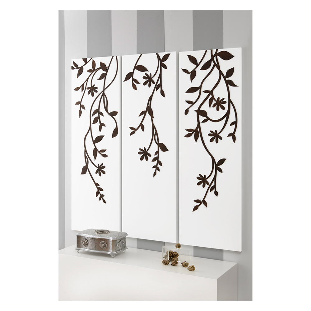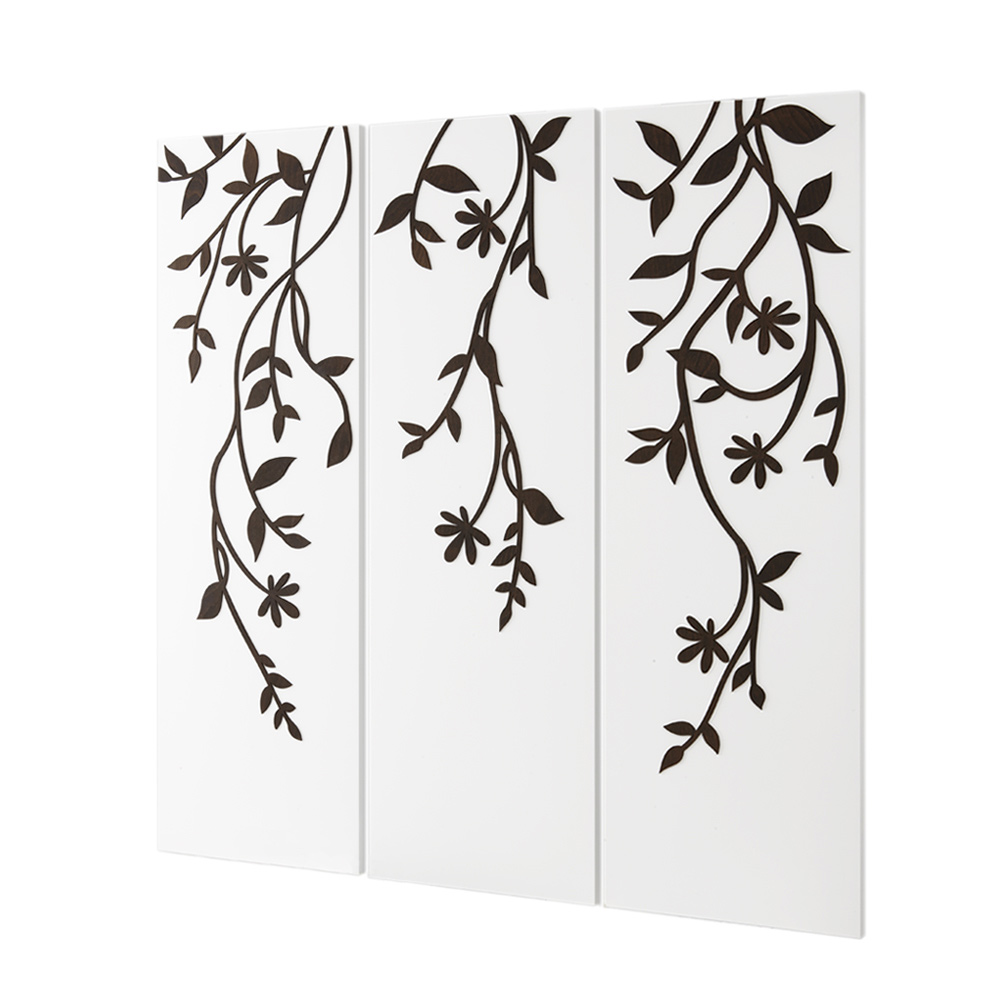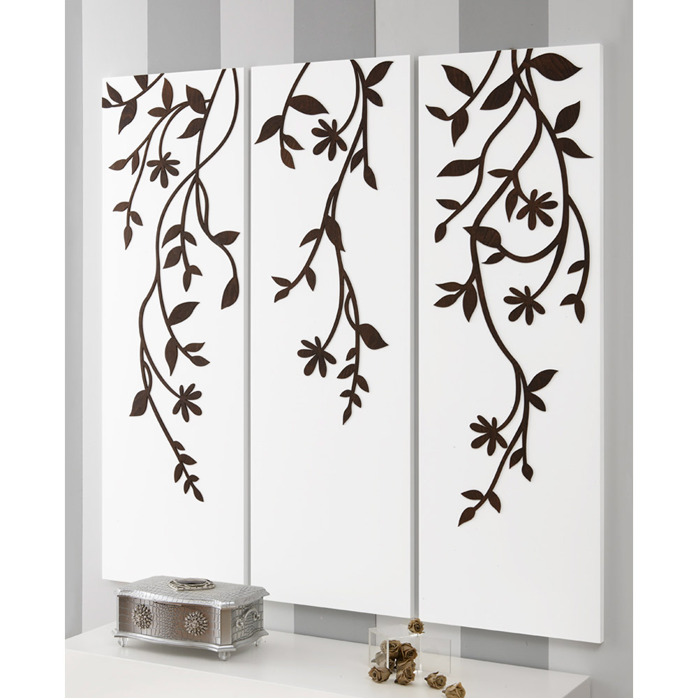 Sammensætning af 3 paneler til at hænge individuelt i mat hvidlakeret træ med wengé-træpåføring, der repræsenterer grene med blade, der falder fra oven.