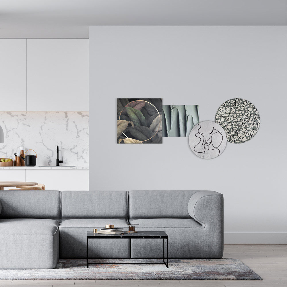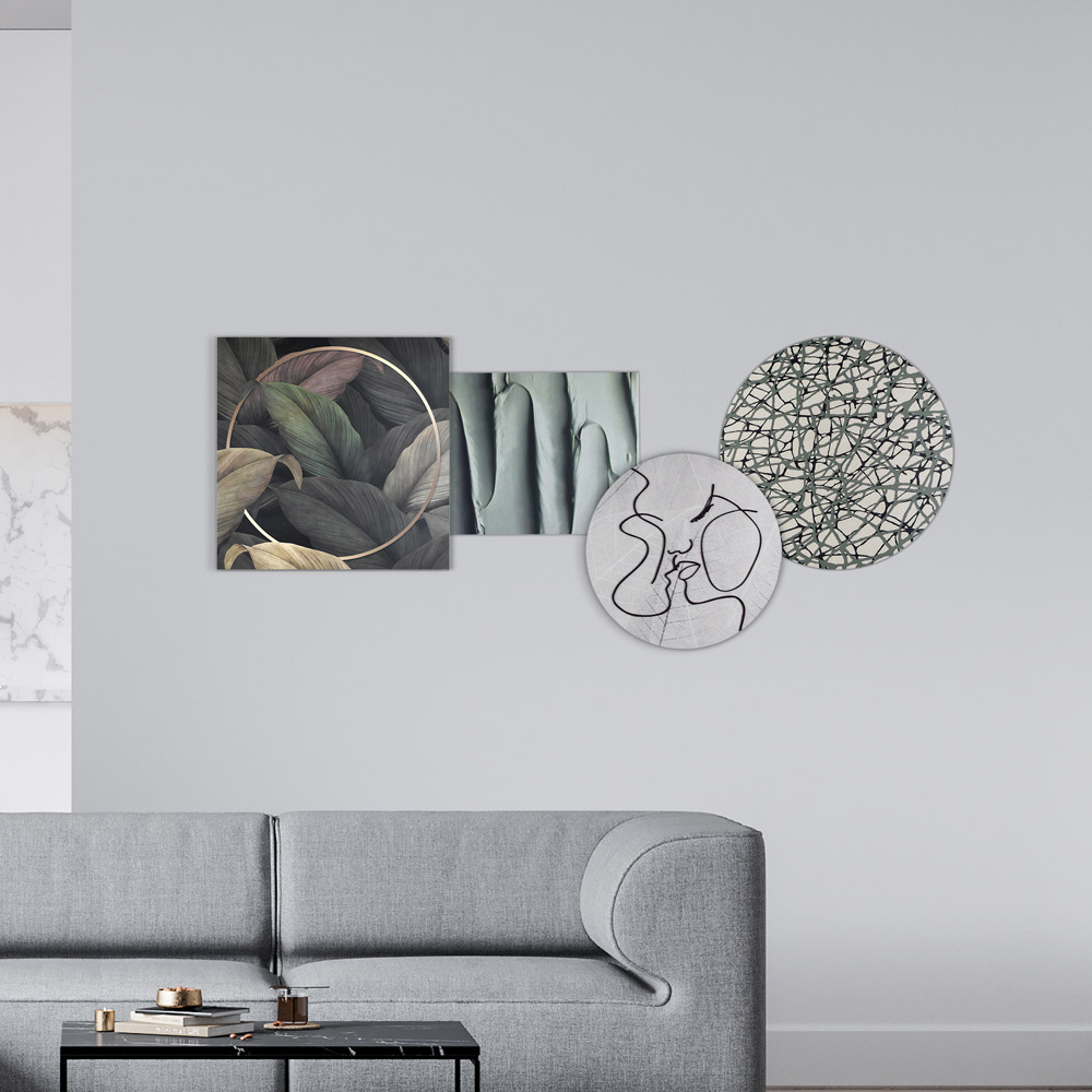 Sammensætning af fire paneler i forskellige former og størrelser, der kombinerer laser- og printdekorationer . Sammensat af fire trykte træpaneler : et firkantet med blade, et rektangulært med buede linjer, et rundt, der viser kysset og et rundt med sammenflettede linjer i grønne og sorte nuancer.
