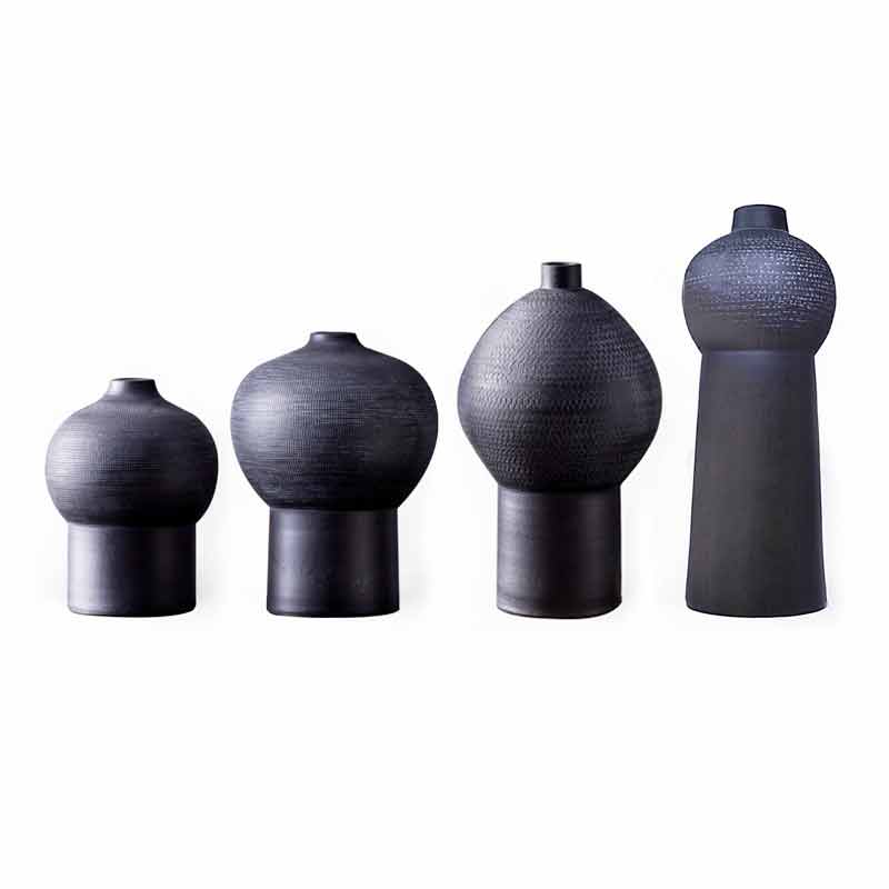 Sammensætning af 4 vaser i forskellige størrelser lavet af dekoreret keramik.