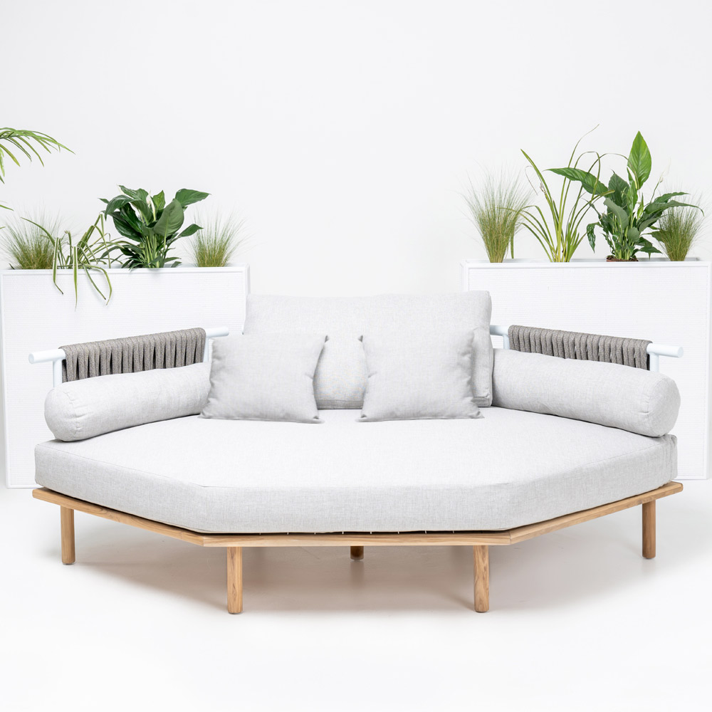 Hjørnesofa i teak, aluminiumsryglæn og vævning i Olefin/PP ROPE og hynde