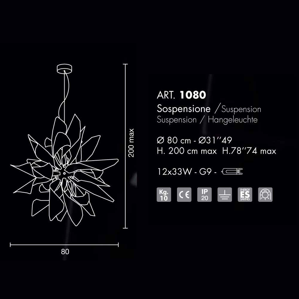 Ingefær er en samling af vigtige dimensioner, i stand til at berige et miljø med tilstedeværelsen af hans mange bands, der danser i luften. Trods bliver lavet udelukkende af metal, tilstedeværelsen af frie pærer sikrer en fremragende lyse resultat og er beregnet til 'brug af 12 33W pærer - G9.