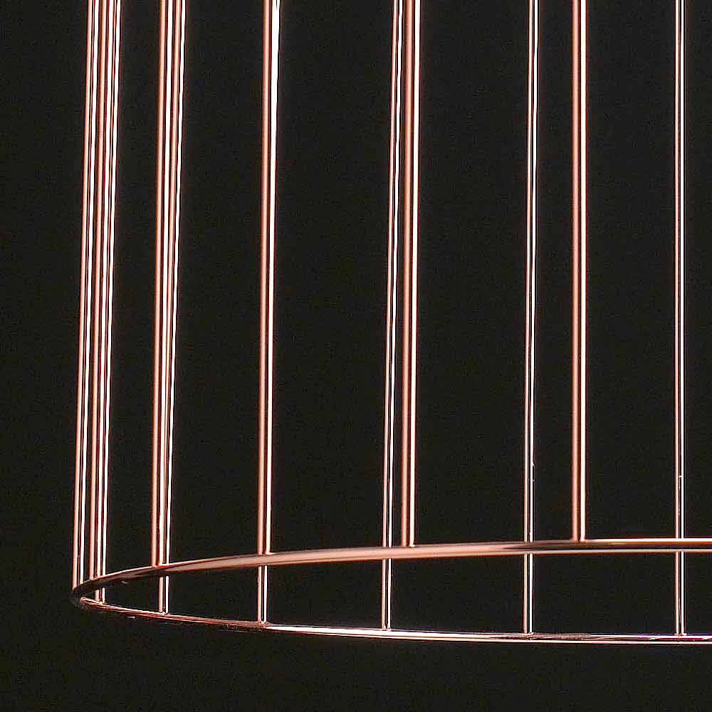 Kluvì er samling af tre suspensioner og te support lamper, som kan nå en betydelig størrelse, bestående af et metal bur og en kugle i mælkehvid blæst glas. Finish: poleret kobber; forberedt til den 'utiizzo 1 pære 70W - E14.