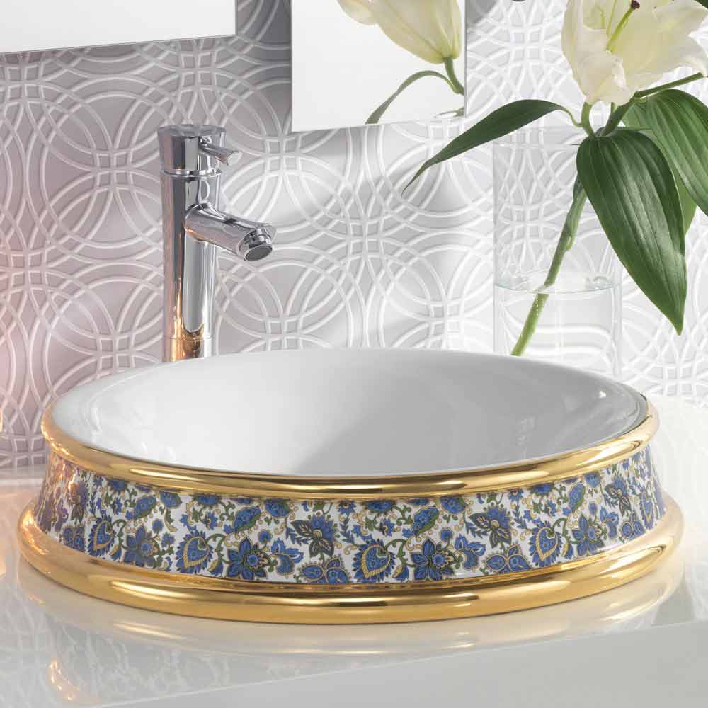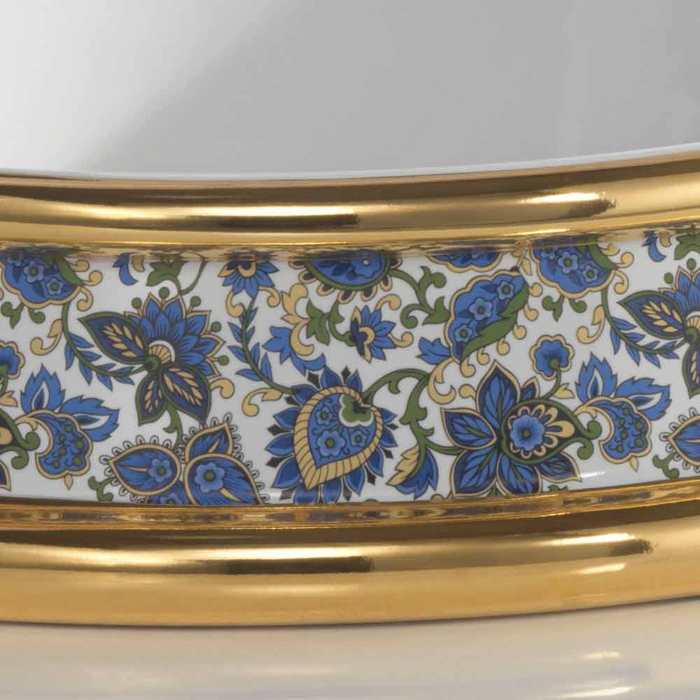 Badeværelsestøbt vask lavet i Italien i ild ler, håndlavet, med stribe med en blå og guld blomsterdekoration og ringe malet i 24k guld.