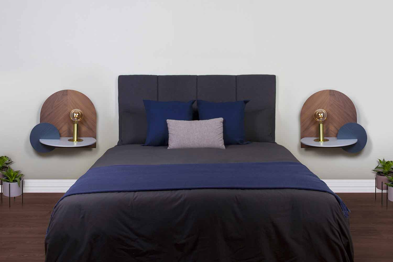 Dette modulopbyggede sengebord repræsenterer en innovativ og original idé, der er i stand til at erobre al opmærksomhed inde i rummet takket være sin unikke stil og kombinationen af materialer og finish, der giver elegance og et ekstremt moderne design . Dens struktur består af 3 krydsfinerpaneler , en i valnøddetræsfinish og to i blå og gråmalet askefinish . Panelet, der fungerer som en ægte støtteflade, er fastgjort til væggen, og de 2 modulære paneler er monteret på den, som kan placeres i 8 forskellige konfigurationer, hvorved der opnås et produkt, der kan tilpasses efter ens behov og rum. Strukturen har også et kabelhul placeret bag frontpanelet, så de kan skjules og gør sengebordet endnu mere funktionelt og praktisk. Mellem de lodrette paneler og væggen er der et 9 cm rum, der kan bruges til at opbevare og organisere bøger og magasiner eller andre genstande, hvilket optimerer den tilgængelige plads til det bedste.