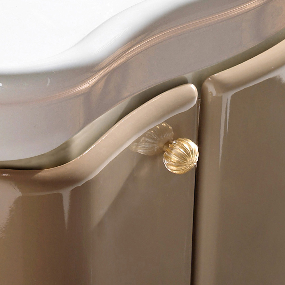 Badeværelsesskab i MDF med to låger og tofarvet karamel blank lakeret skuffe med elfenben struktur , med hvid keramisk vask . Messingknopper og vask medfølger.