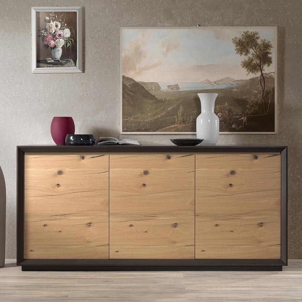 Skænk med struktur fineret på mørkebrunlakeret poppelspånplade og 3 sorte stukbeklædte briccola låger med rilleåbning . Træfod H 4cm.