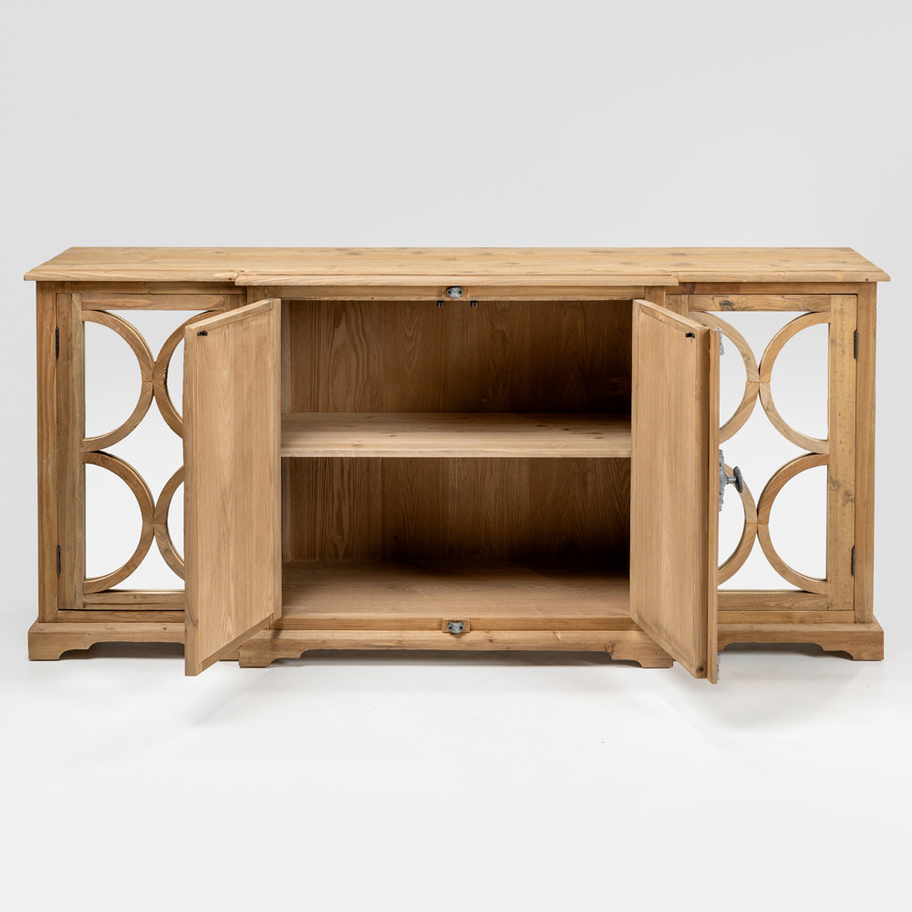 Denne skænk i gammelt, naturligt fyrretræ er et iøjnefaldende møbel med elegante spejllåger , der tilføjer lysstyrke og dybde til rummet. Den gamle finish fremhæver træets tekstur og fremhæver dets årer, knaster og naturlige ujævnheder.