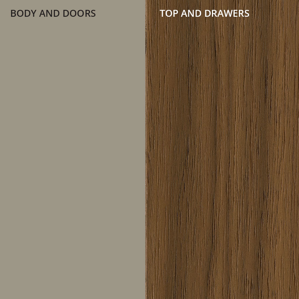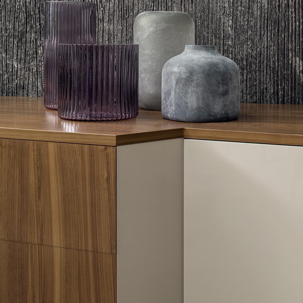 Denne skænk til stuen har en struktur lavet udelukkende af lakeret MDF i sand finish og top og 2 skuffer i fineret træ i Canaletto valnød finish.