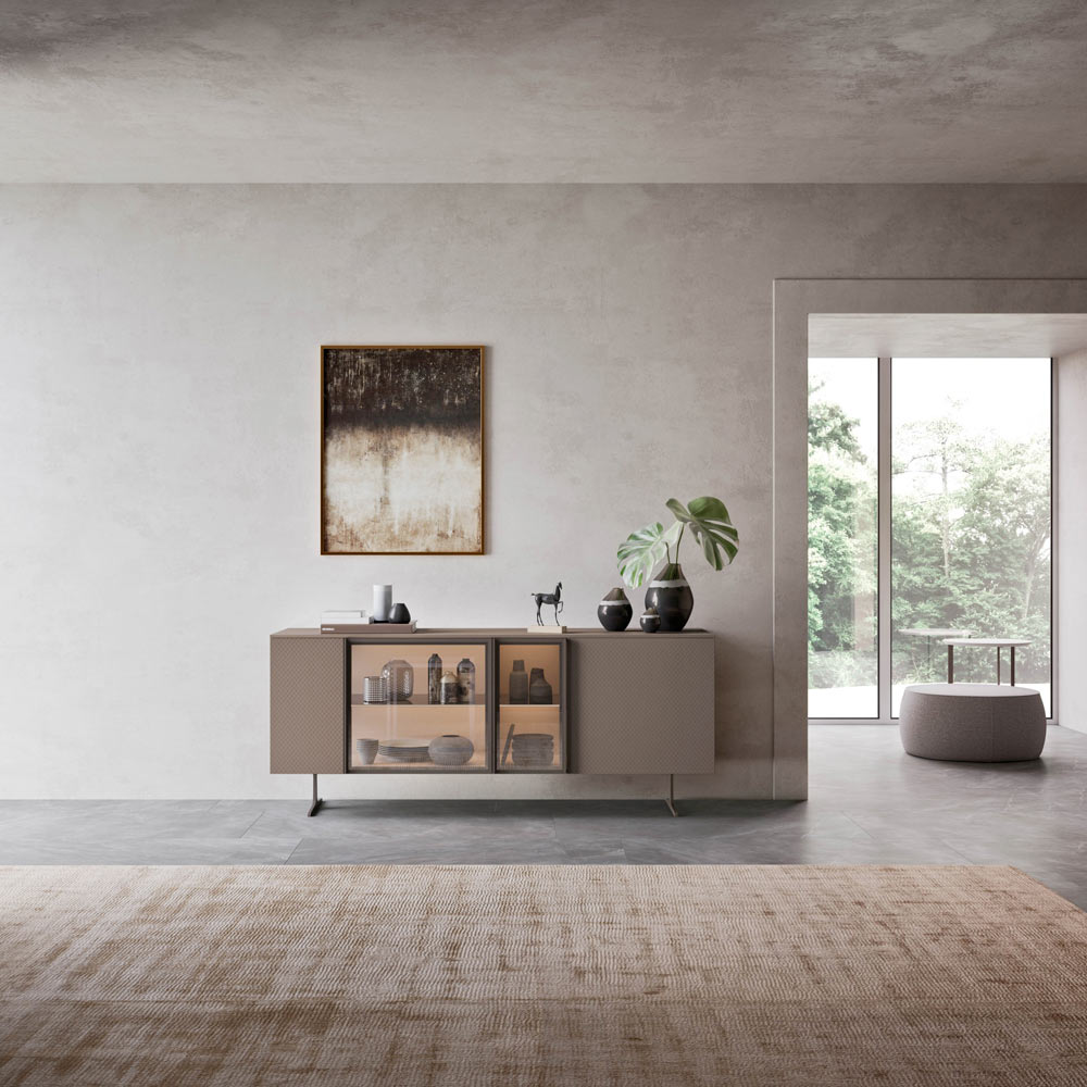 Skænk til stue med 4 døre i økologisk træ og designglas fremstillet i Italien.