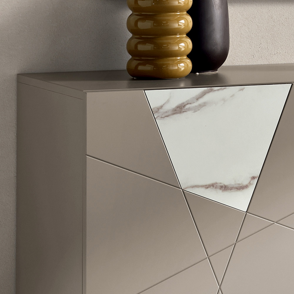 Strukturen er lavet af en melaminbelagt træramme og pantograferede MDF-døre med dekorative graveringer, der krydser hinanden i et elegant geometrisk design. Glasindsatserne med marmoreffekt beriger overfladen og skaber et sofistikeret samspil mellem grafik og materialer.