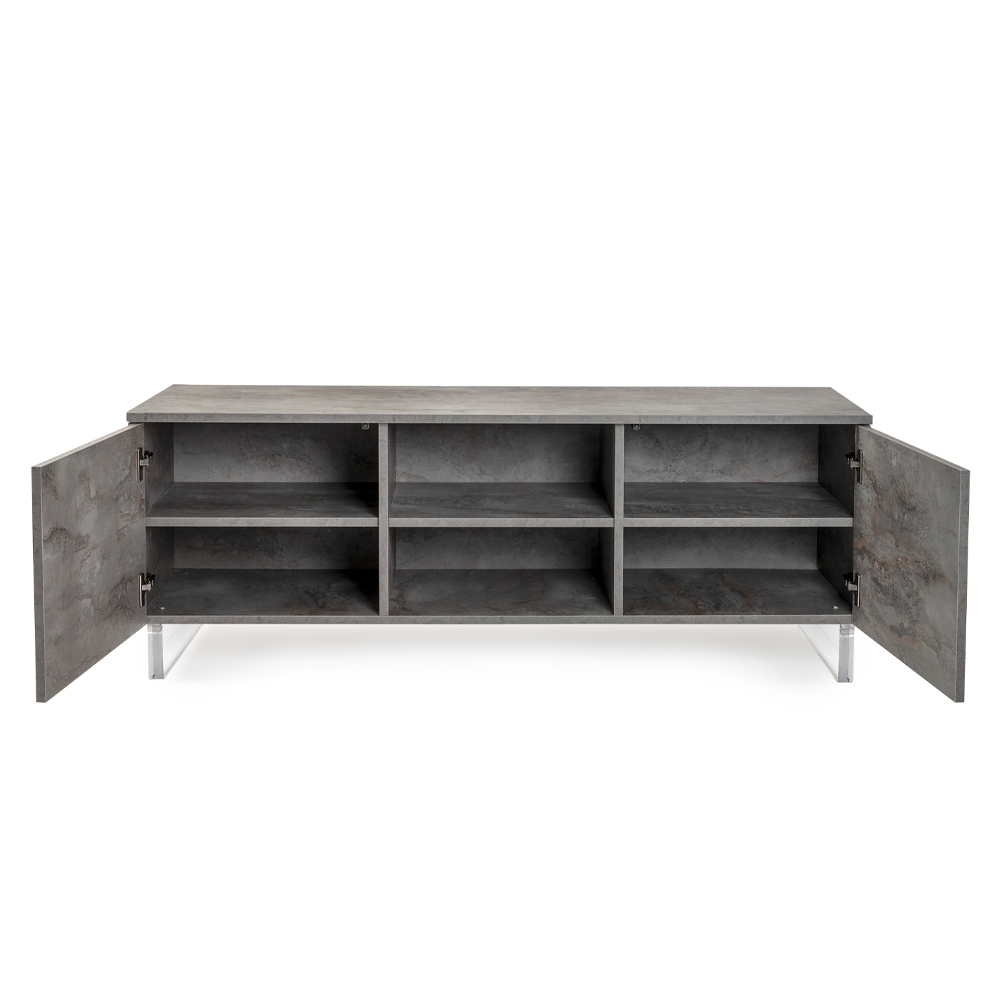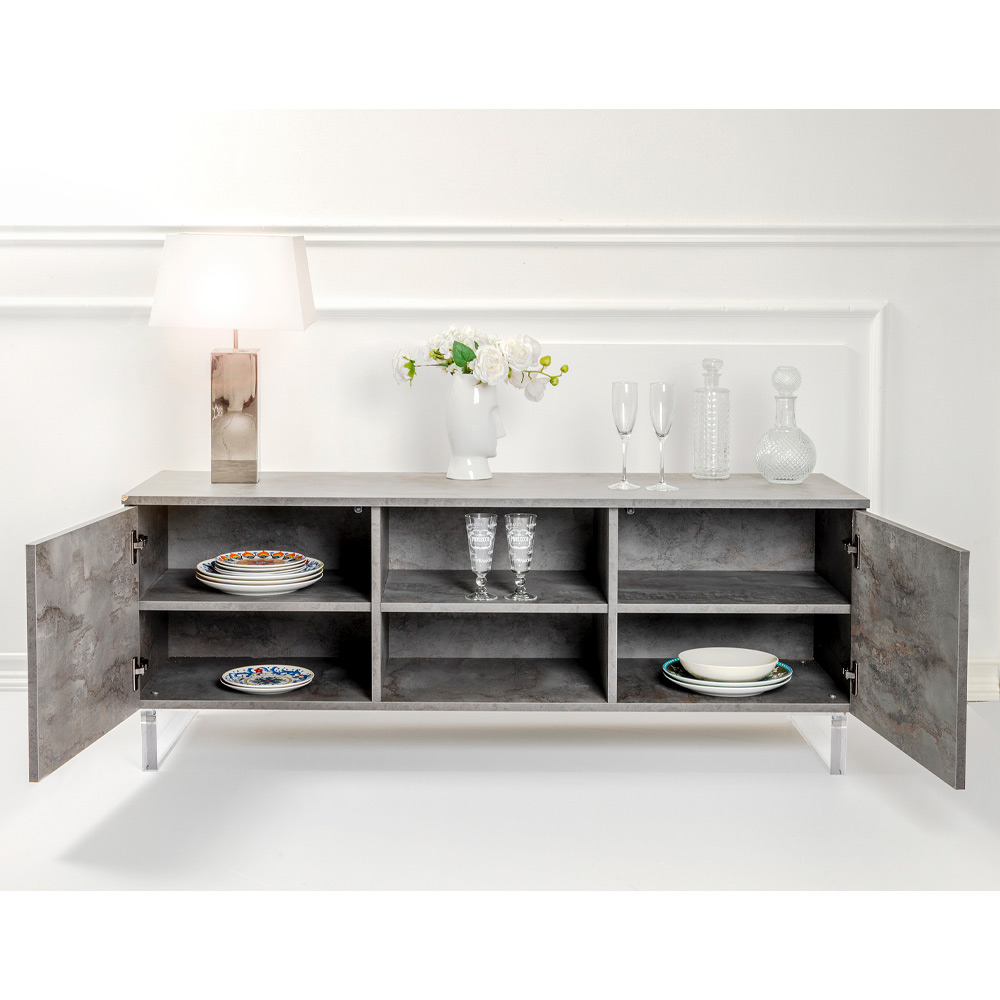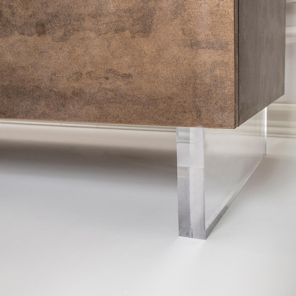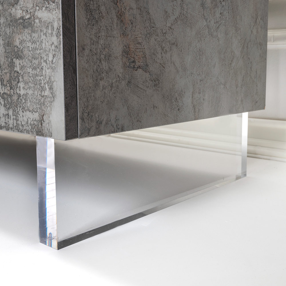 Ophængt på gennemsigtige plexiglasfødder giver denne skænk en illusion af at svæve i rummet, hvilket giver en unik og overraskende visuel lethed . Åbn de hængslede døre for at afsløre et rummeligt interiør, med hylder, der venter på at rumme bøger, genstande og souvenirer, alt sammen organiseret med maksimal effektivitet.