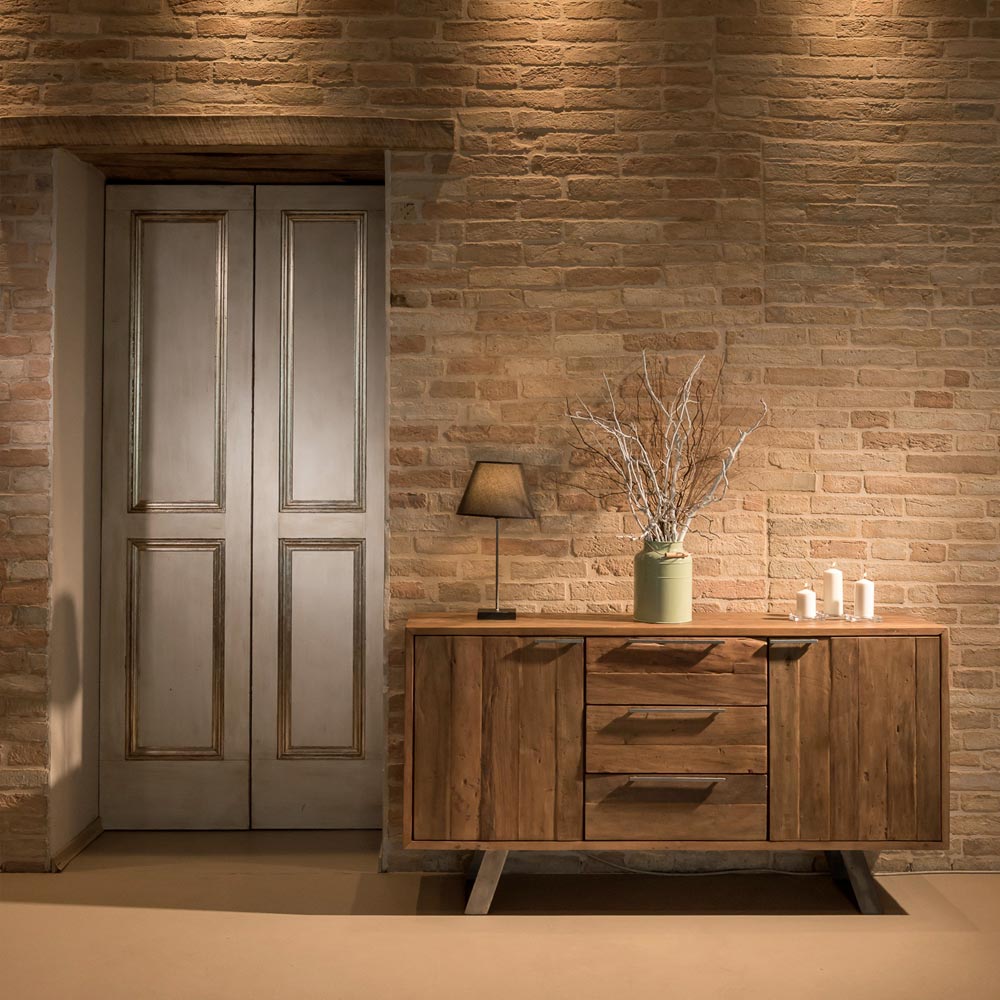 Dette møbelsæt er bogstaveligt talt unikt , netop fordi det legemliggør den ejendommelige historie om levet stof. Bearbejdningen foregår for størstedelens vedkommende efter håndværksmæssige procedurer . Hver ridse og ufuldkommenhed, hvert ar på træet, vidner om originaliteten af en fortid, der får nyt liv. Det tropiske træ, der er lovligt genbrugt fra gamle artefakter, både og forladte bygninger, behandles og børstes eksperter for at genvinde værdighed og glans. Dette produkt kombinerer essensen af rustik smag med formerne af moderne design og med nogle detaljer fra den industrielle stil .
