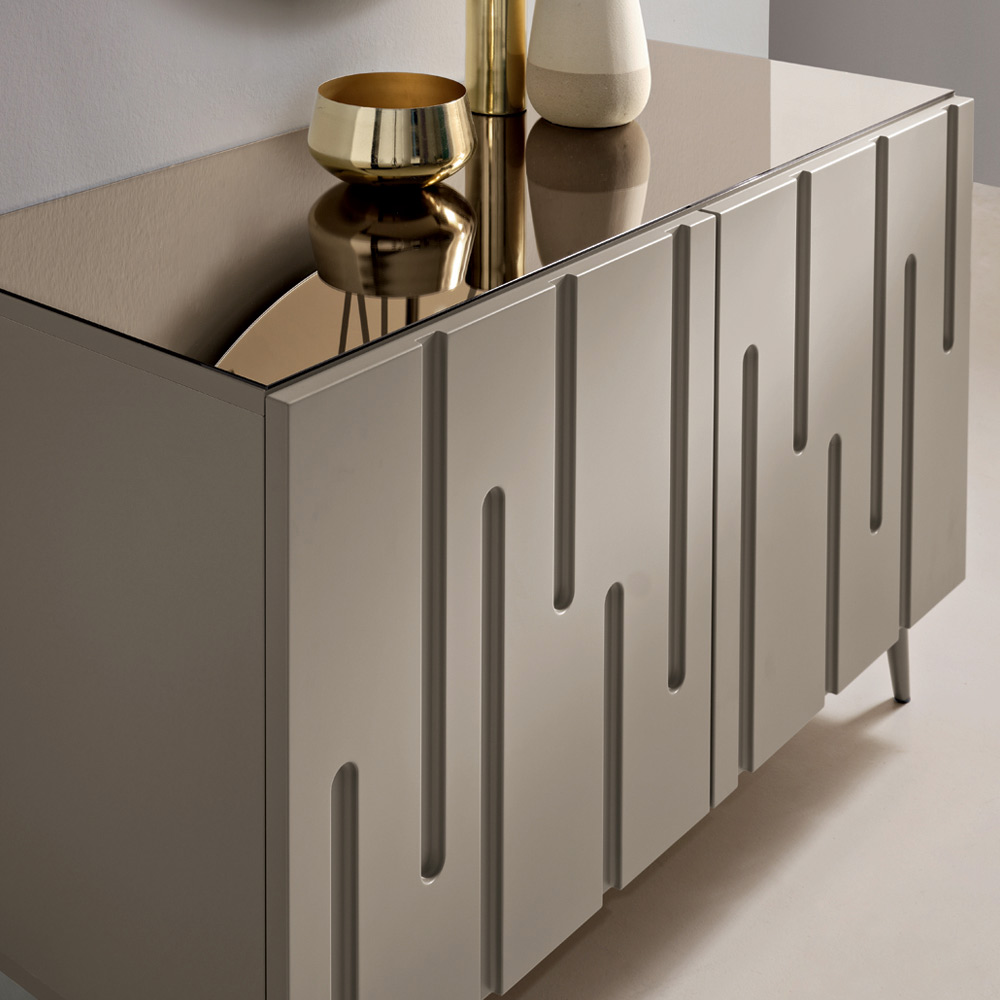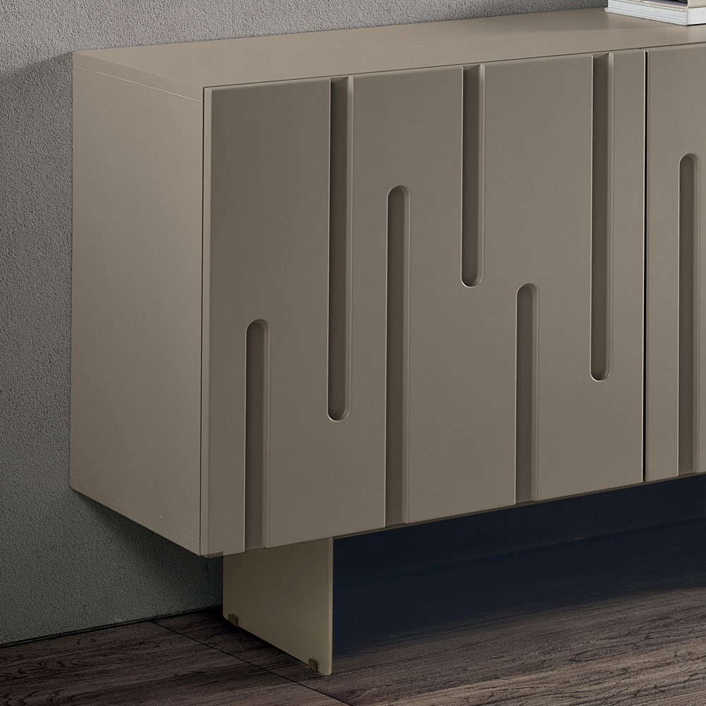 De PVC-belagte MDF-døre har uregelmæssige lodrette indsnit , der minder om den naturlige strøm af stalaktitter og stalagmitter , hvilket skaber en raffineret, tekstureret og dynamisk effekt. Dette samspil af relieffer giver dybde og bevægelse til overfladen, hvilket forstærker lyset og gør skænken til rummets midtpunkt.